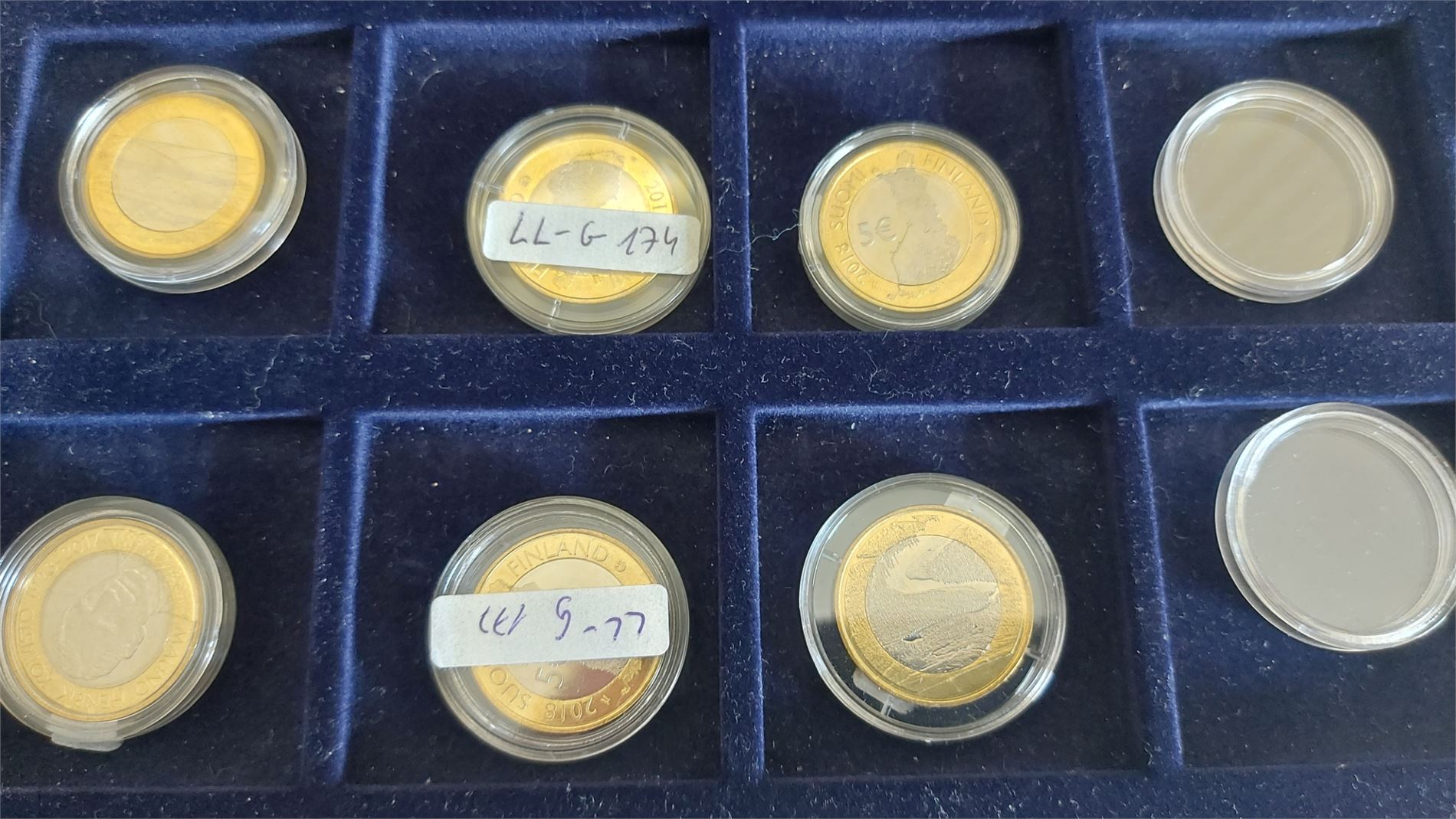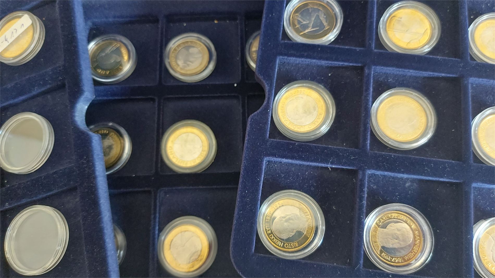 FINLAND samling 34 olika 5-euromynt i bimetall. Mynten ligger i kapsel i en myntbox.