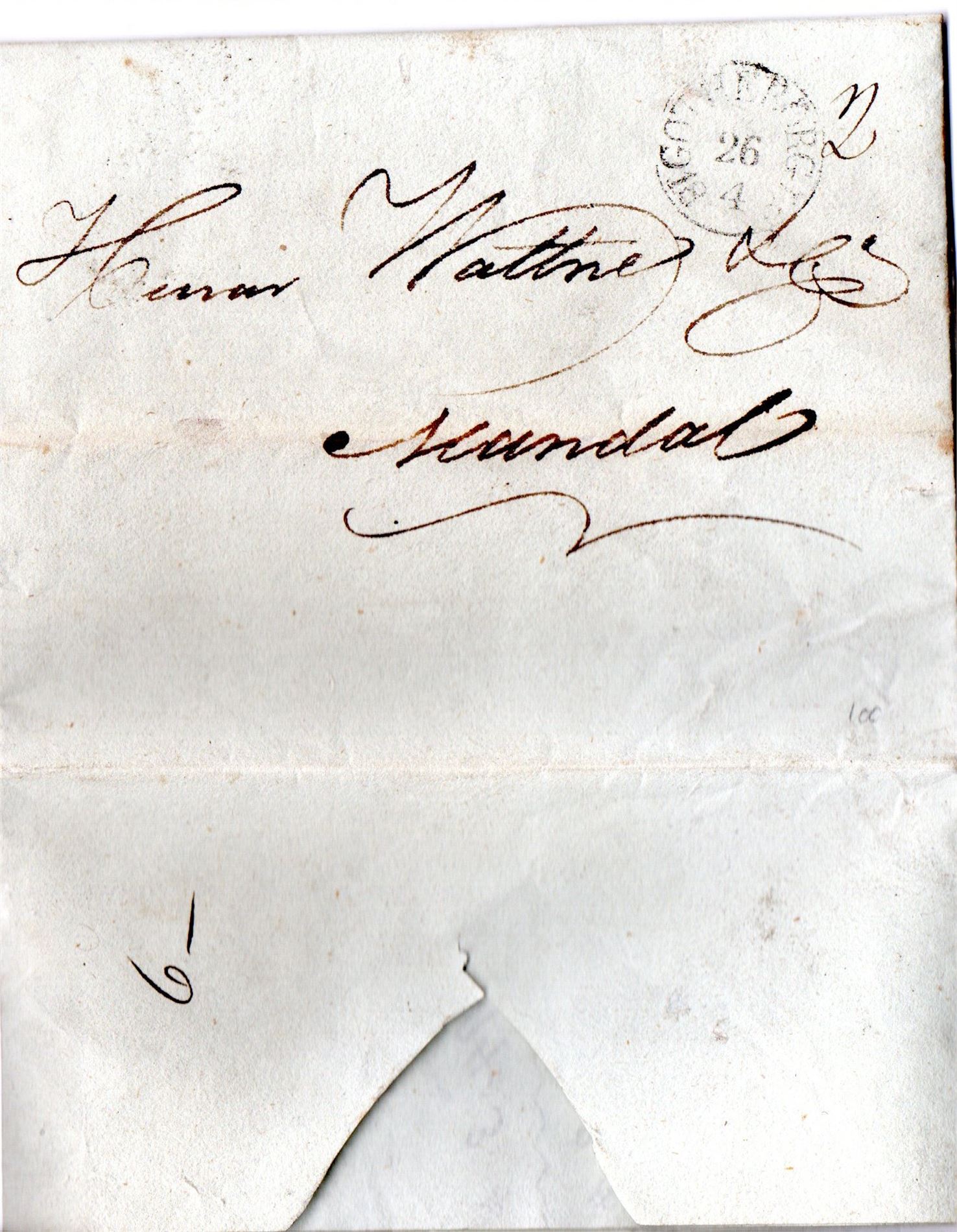 Prefrimbrev fra Gøteborg til Mandal. Datert 25. april 1831. Stemplet Götheborg 26.4. Karteringspåtegninger.