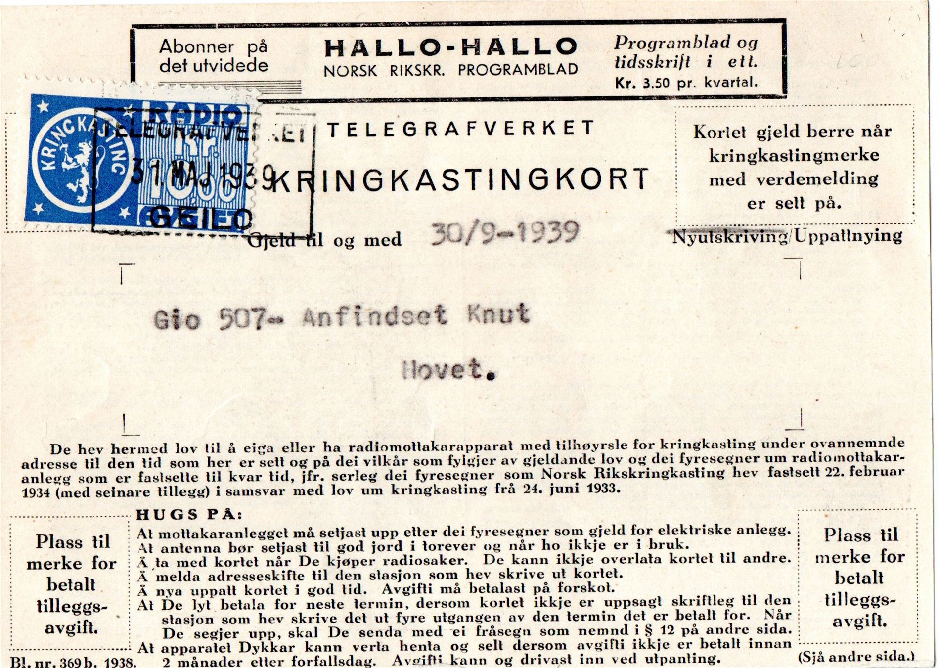 Kringkstningskort påsatt radioavgiftsmerke 10 kr og stemplet Telegrafverket 31. maj 1939 GEILO.