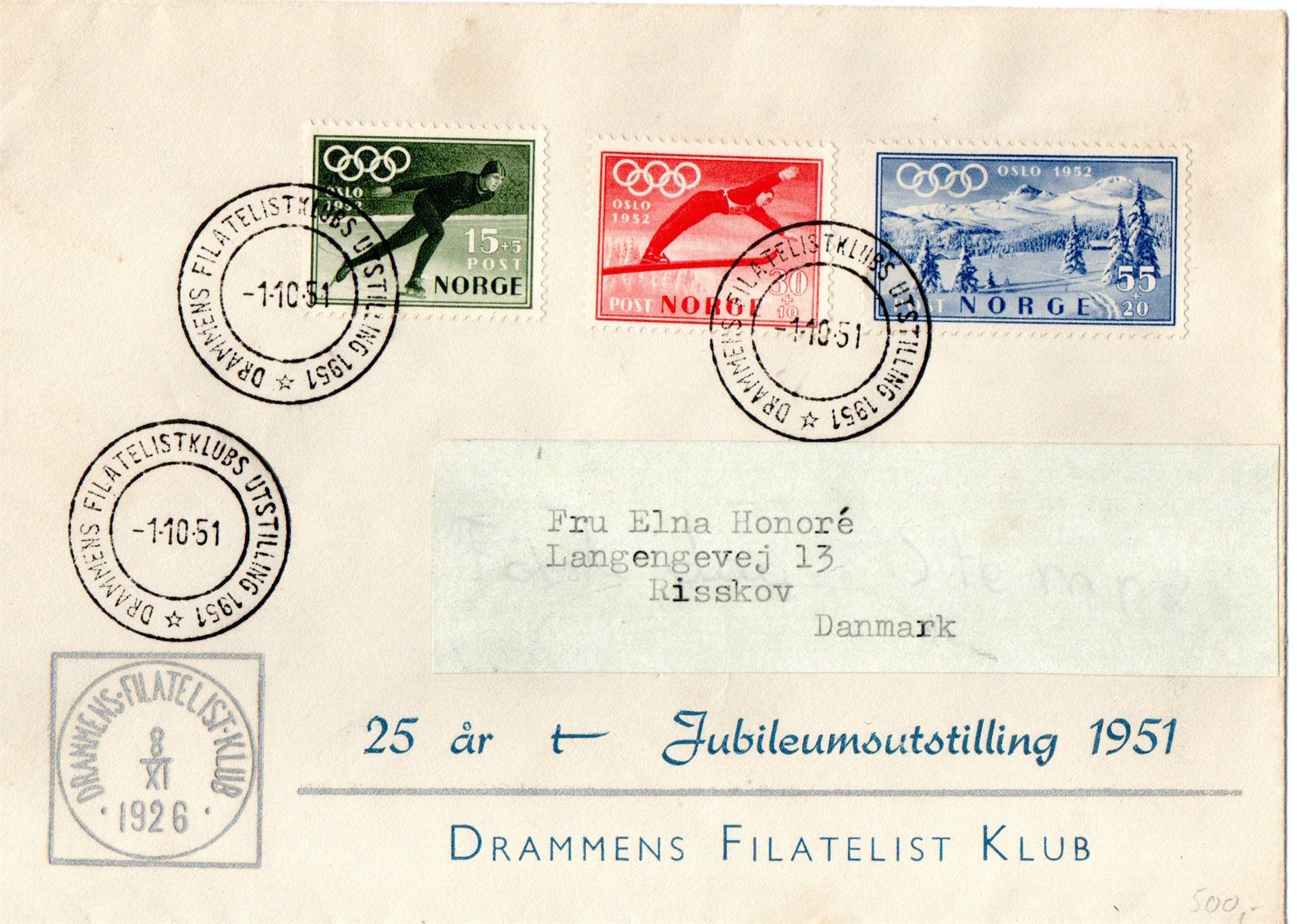 FDC med OL merkene fra 1952, på konvolutt fra Drammens filatelisklubb sin jubileumsutstilling i 1951. Stemplet med utstillingens stempel.