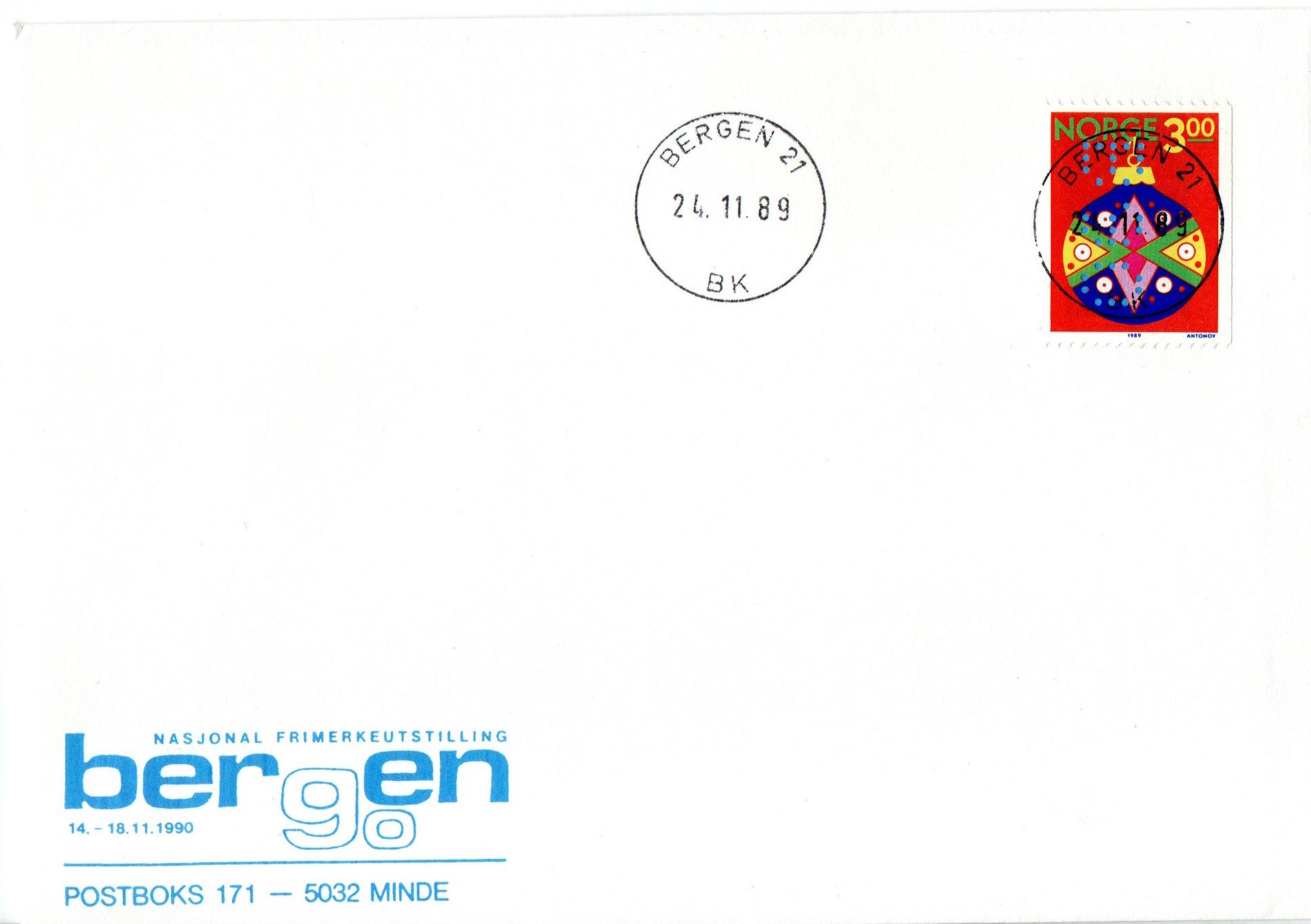 Nk1085 på utstillingskonvolutt fra Bergen 90. Perfins B90 på merket.