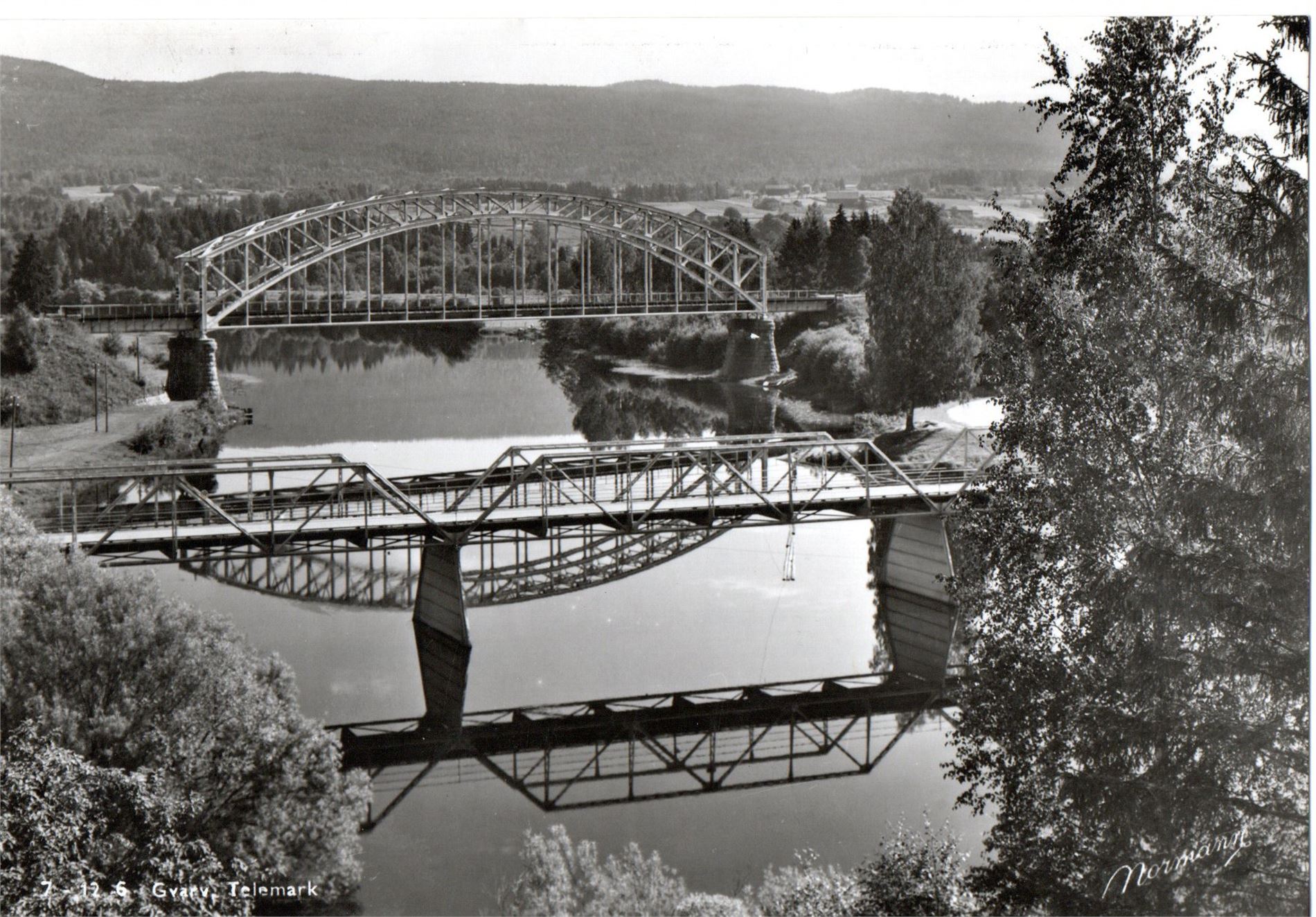 Gvarv i Telemark. Motiv av jernbanebru og veibru. Stemplet Sørlandsbanen. Uleslig litra og dato.