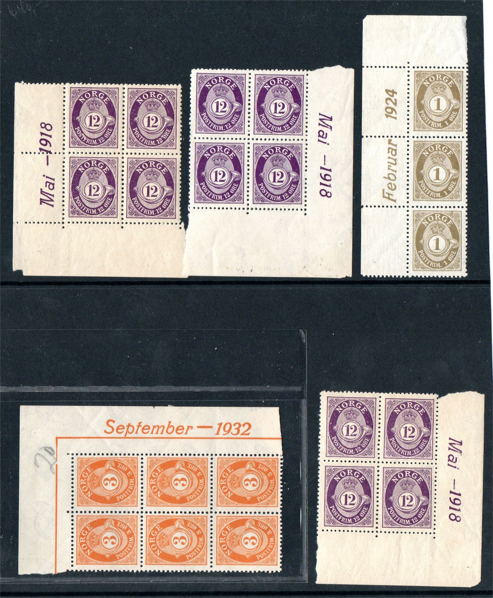 Fem enheter fra posthornserien 1909-29 med trykkeår/mnd i marginalene. Postfrisk.