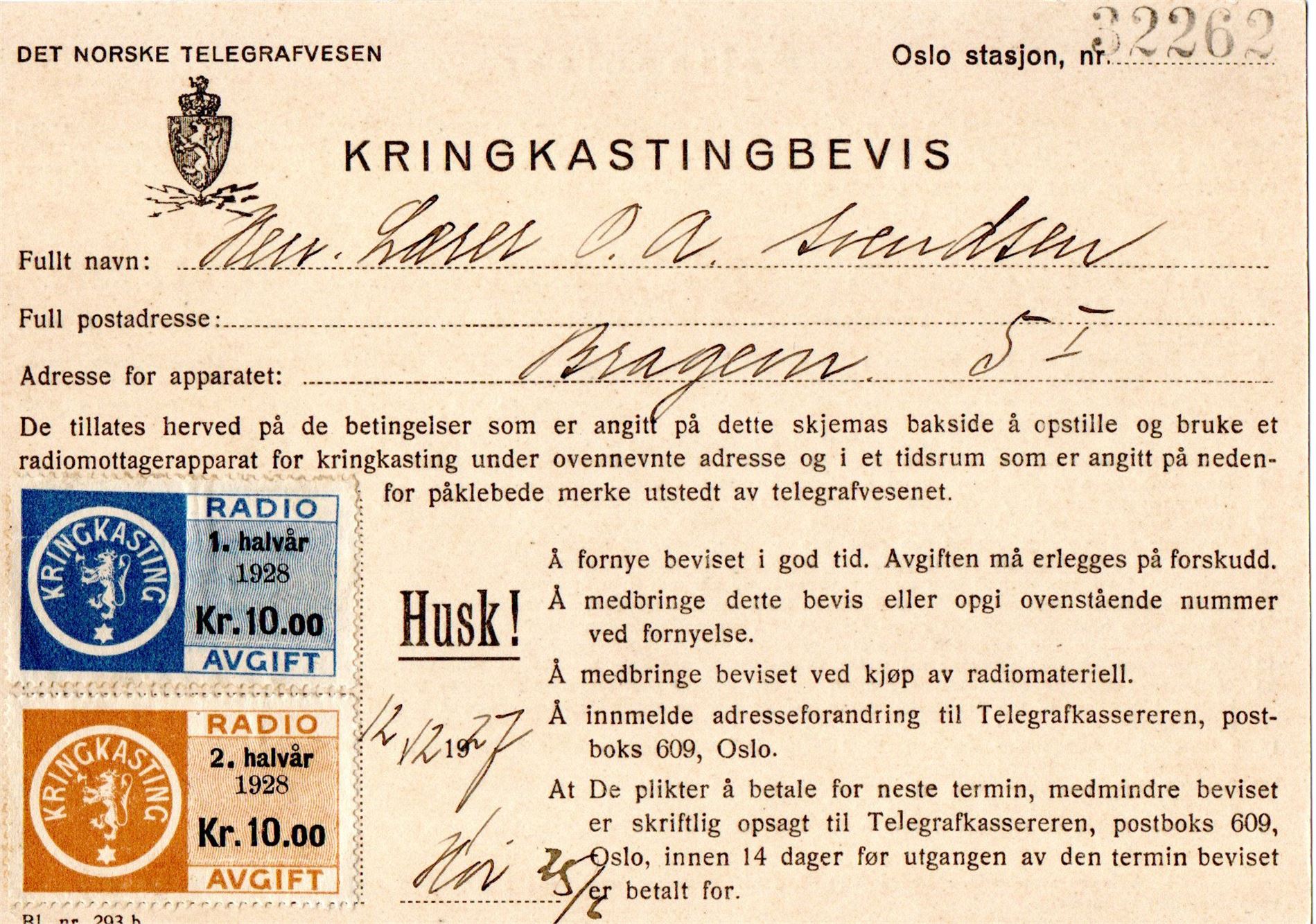 bevis med 2 stk avgiftsmerker for 1. og 2. halvår 1928. Bl. nr 203b.