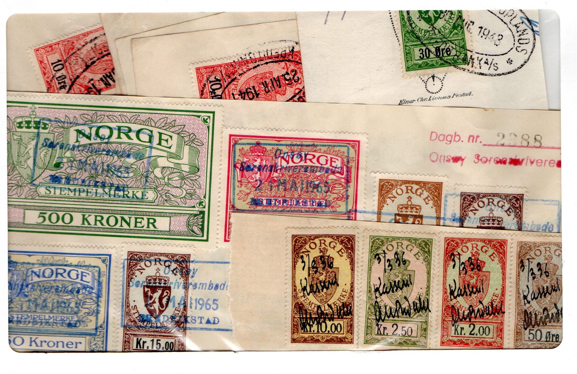 Lot med stempelmerker på klipp fra div dokumenter og kvitteringer. Brutto 50g. Noen håndsignerte.