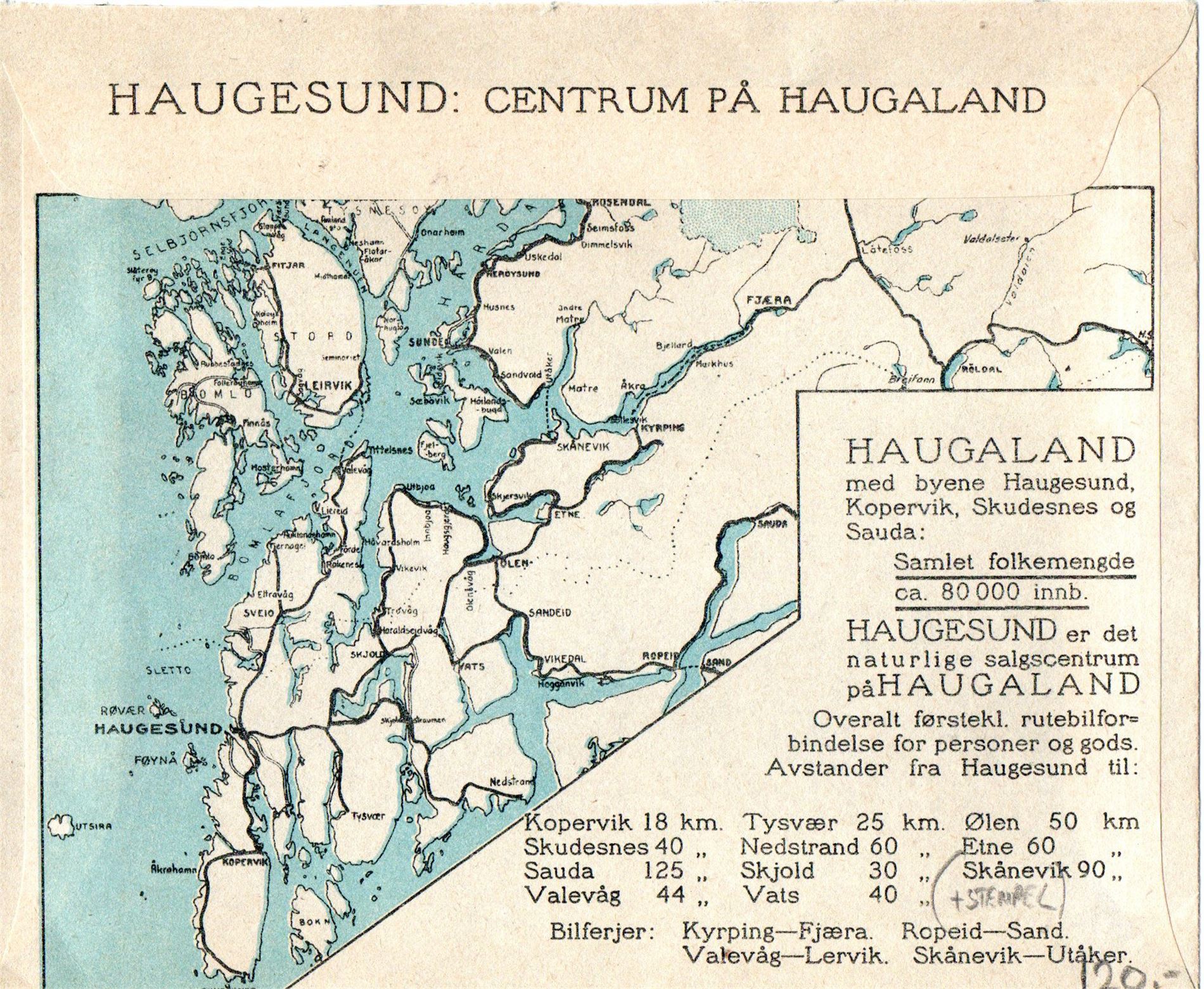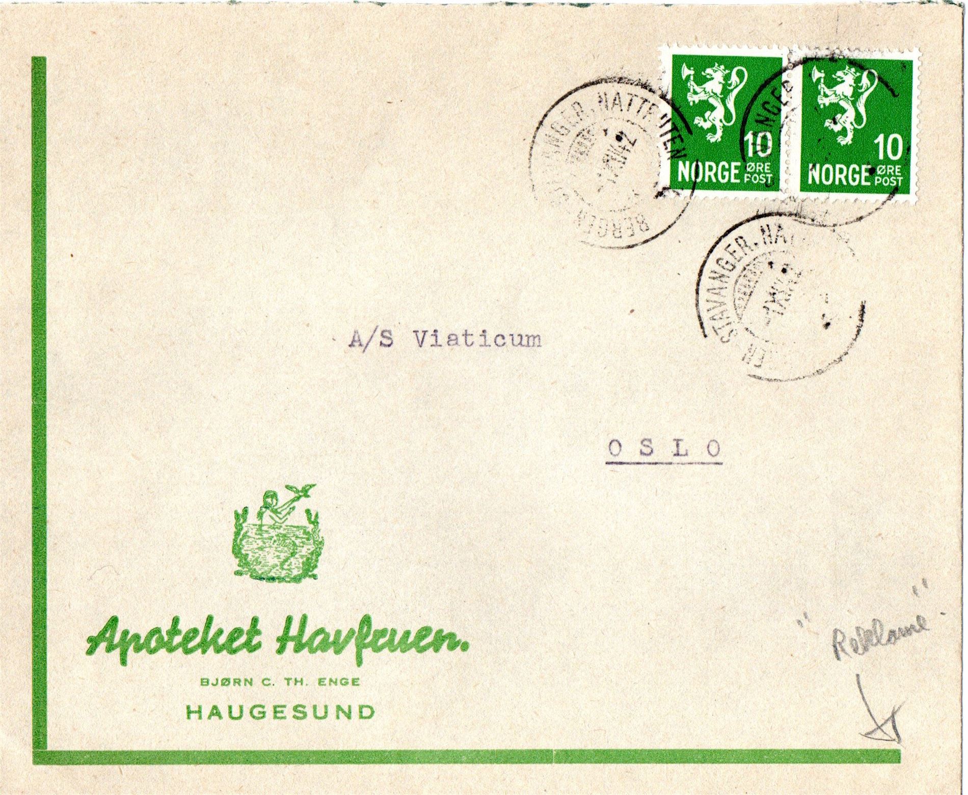 Dekorativ reklamekonvolutt fra Apotek Havfruen. Stemplet Bergen Stavanger nattruten 1942.