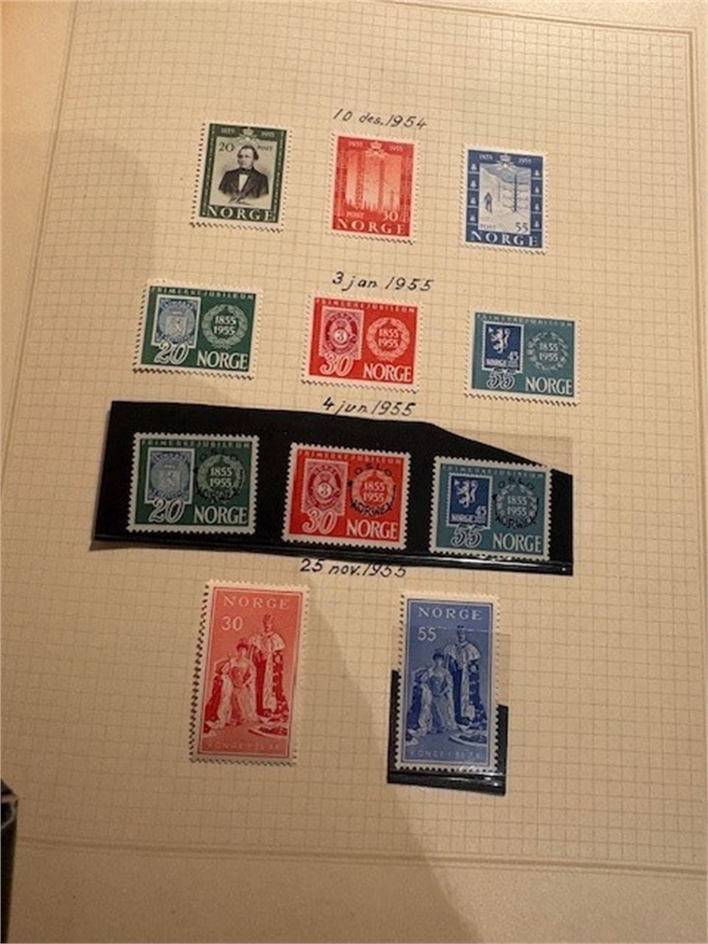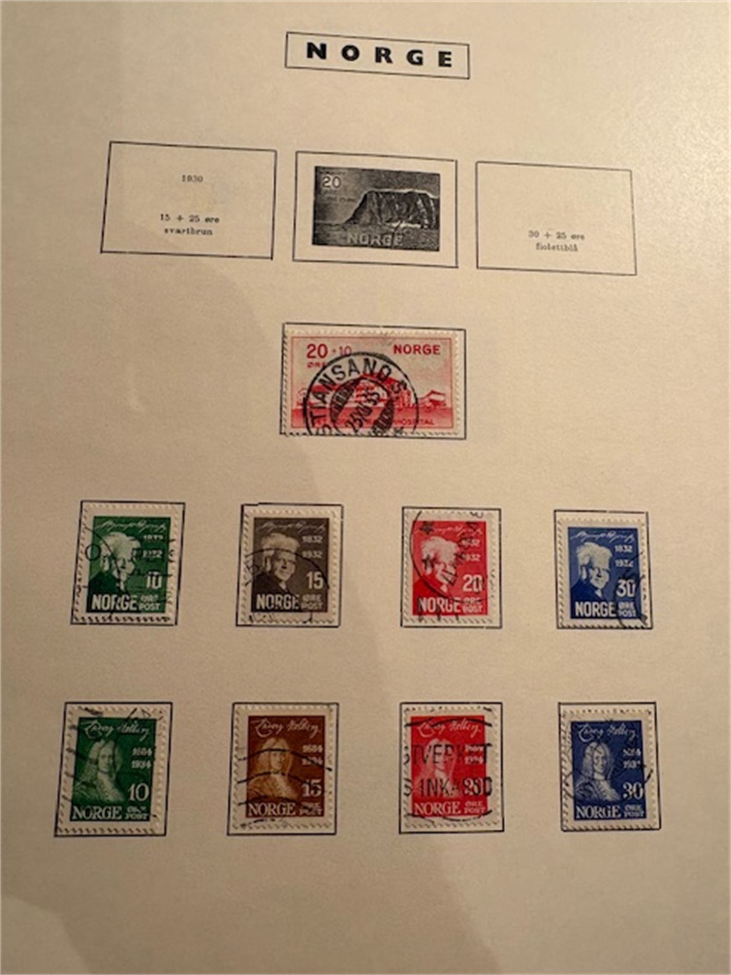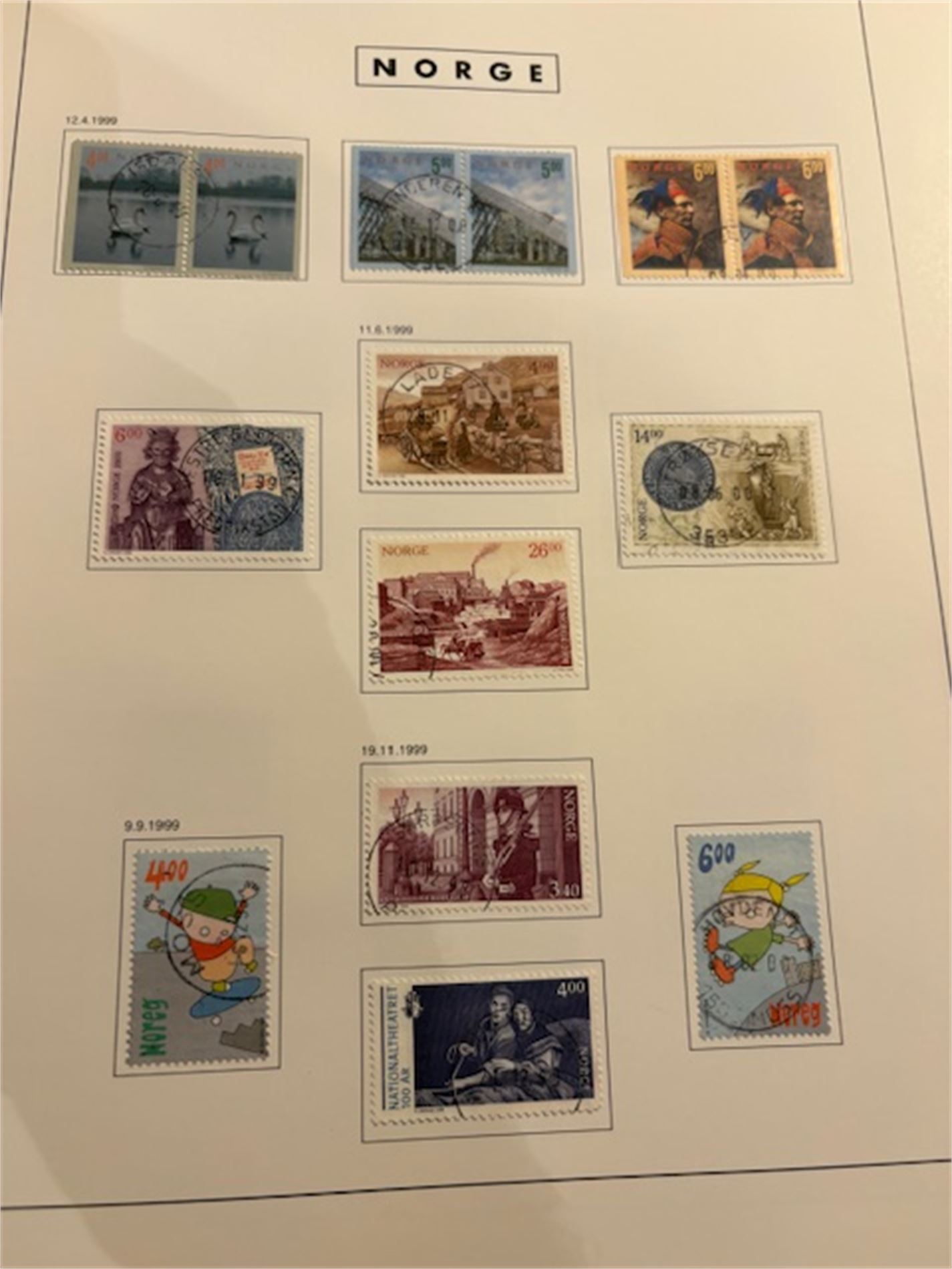 1: To album med stemplede norske frimerker. Albumene omfatter 1855-1999. Få merker før krigen. Deretter mangler det kun et fåtall merker. Inneholder også portomerker og off.sak.