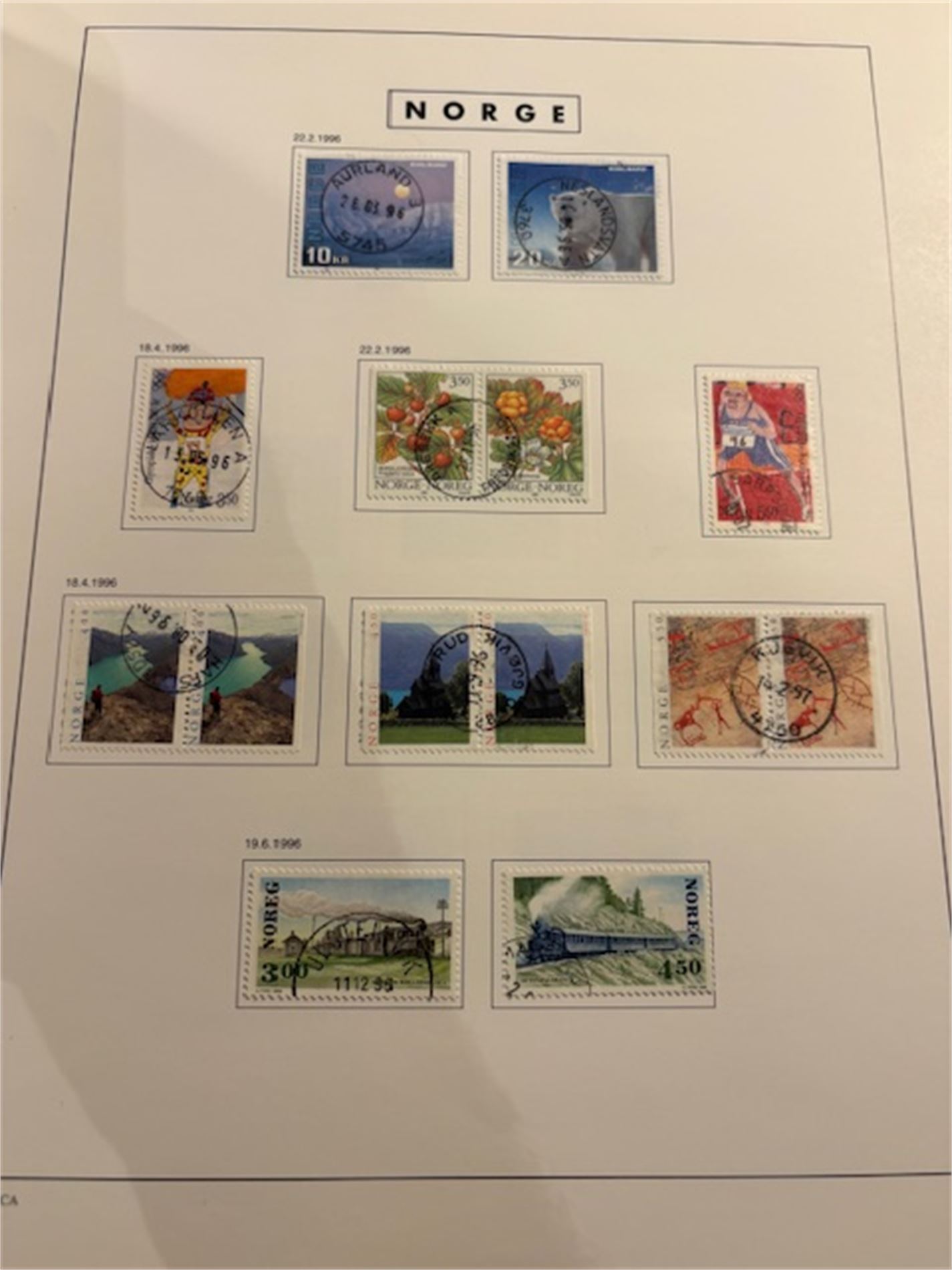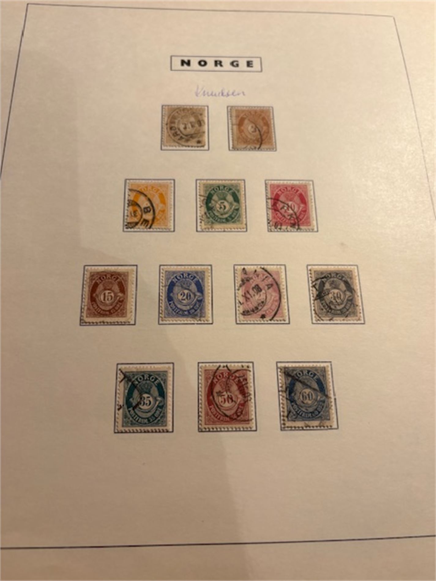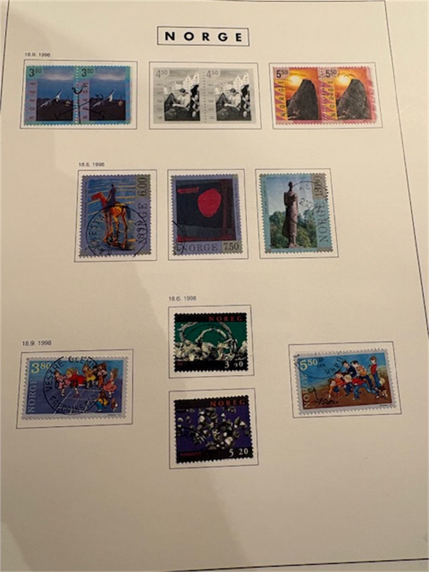 1: To album med stemplede norske frimerker. Albumene omfatter 1855-1999. Få merker før krigen. Deretter mangler det kun et fåtall merker. Inneholder også portomerker og off.sak.