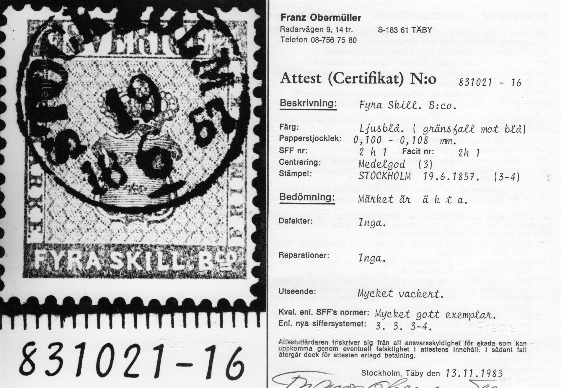 SVERIGE F2 h1 4 skill bco stpl STOCKHOLM 19.6.1857, intyg OBE "mycket gott exemplar, 3.3.3-4 "