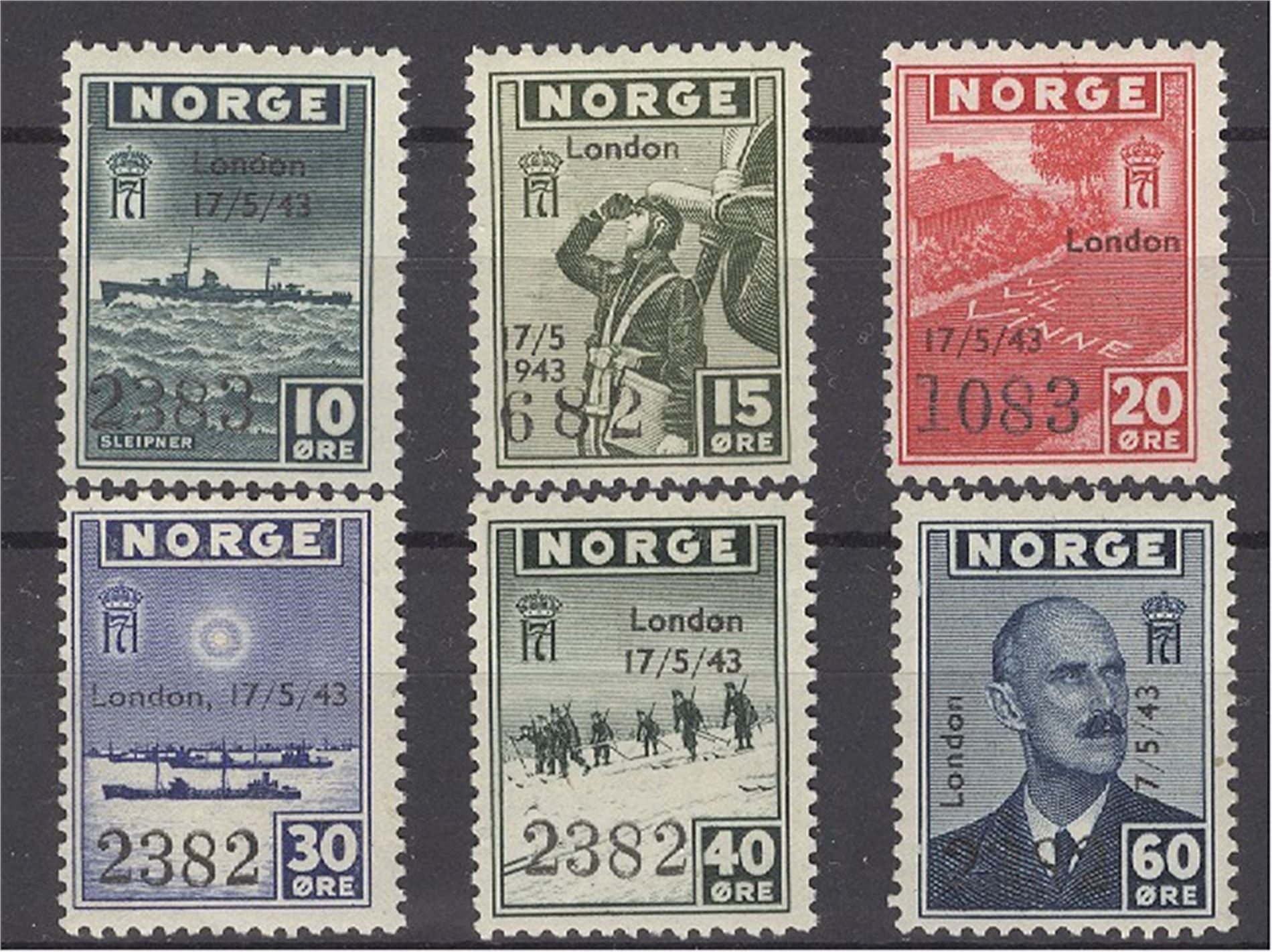 NK 333-338 Overtrykket "London 17/5-43. Alle merker med hengselrest * (7.000.-)