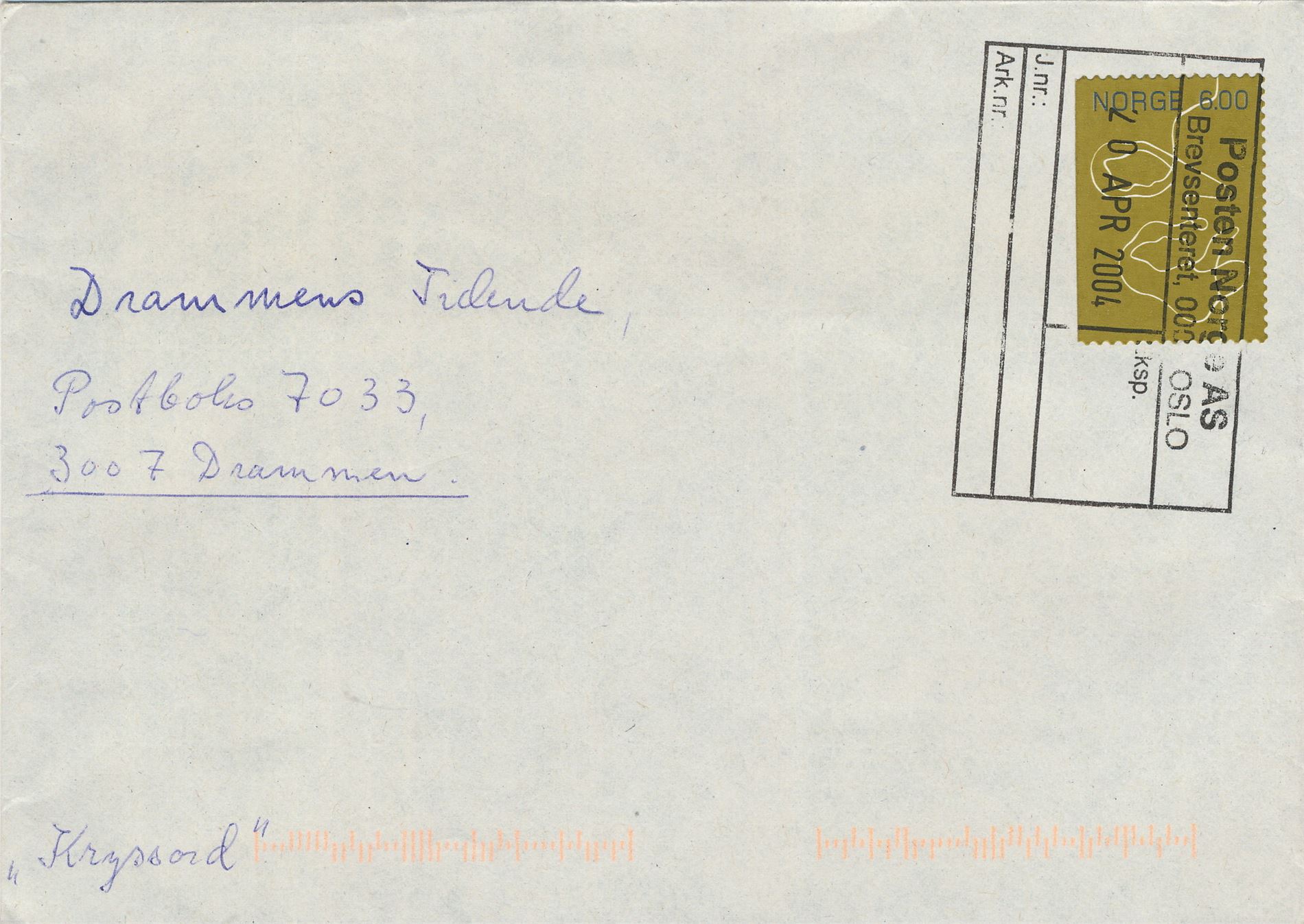 Posthistorie Bruksbrev med NK 1523, sendt fra Oslo til Drammen, med rammestempel fra Posten Norge AS, Brevsenteret Oslo, 20 APR 2004.
