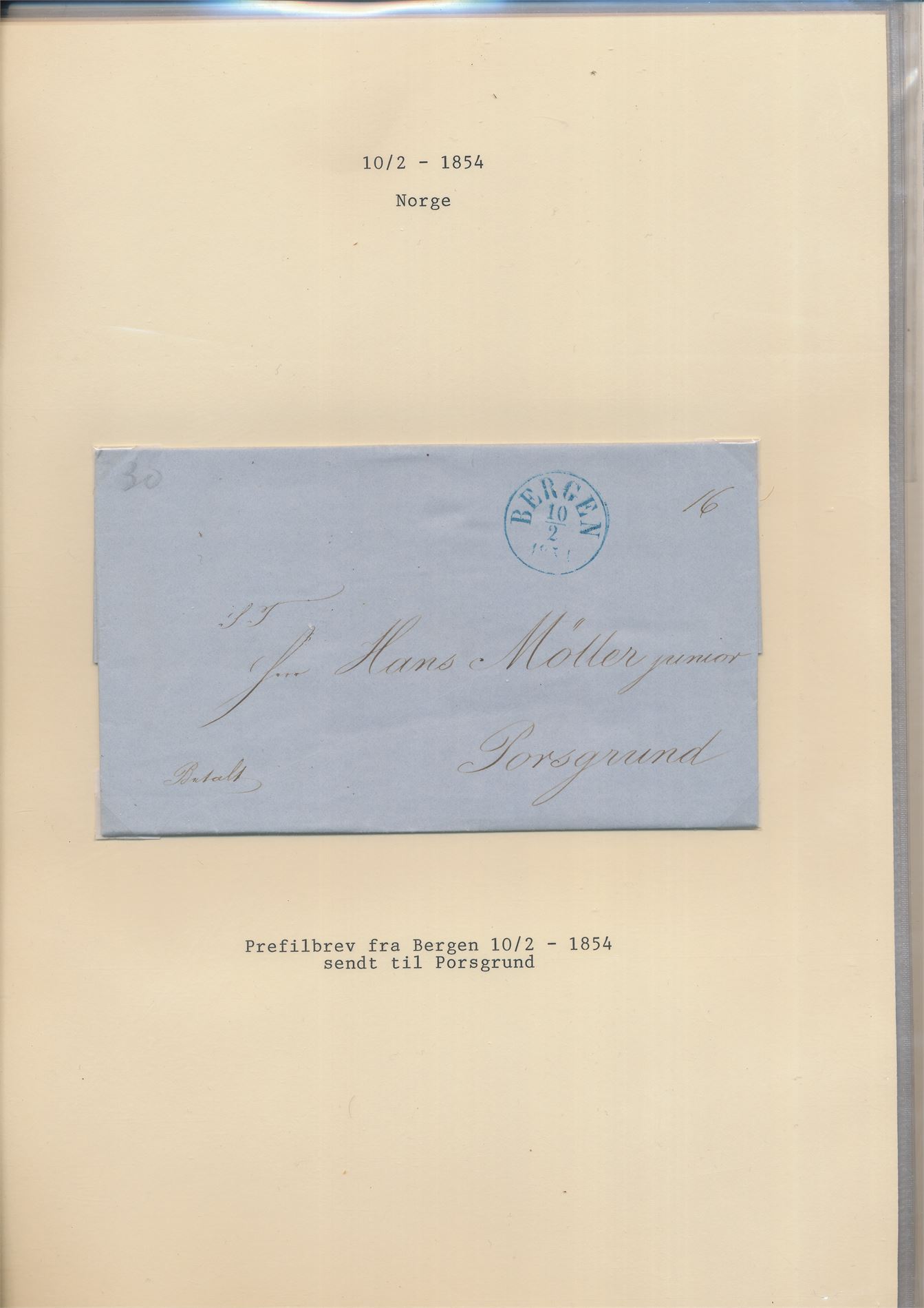 Prefil Lot med 5 Norske prefilbrev, alle fra 1854. Bergen, Fredrikshald, Arendal, Stavanger, Drammen og Trondhjem. Pene brev.