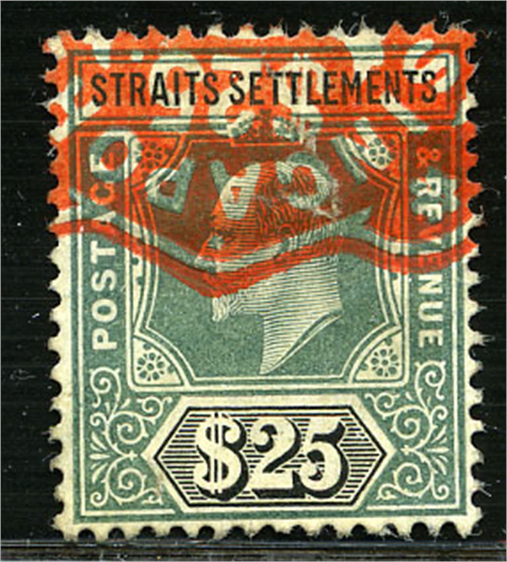 Br. Kolonier STRAITS SETTLEMENTS 139. $25 fiscal with red cancel. Good cond. (£3250 as postally used)