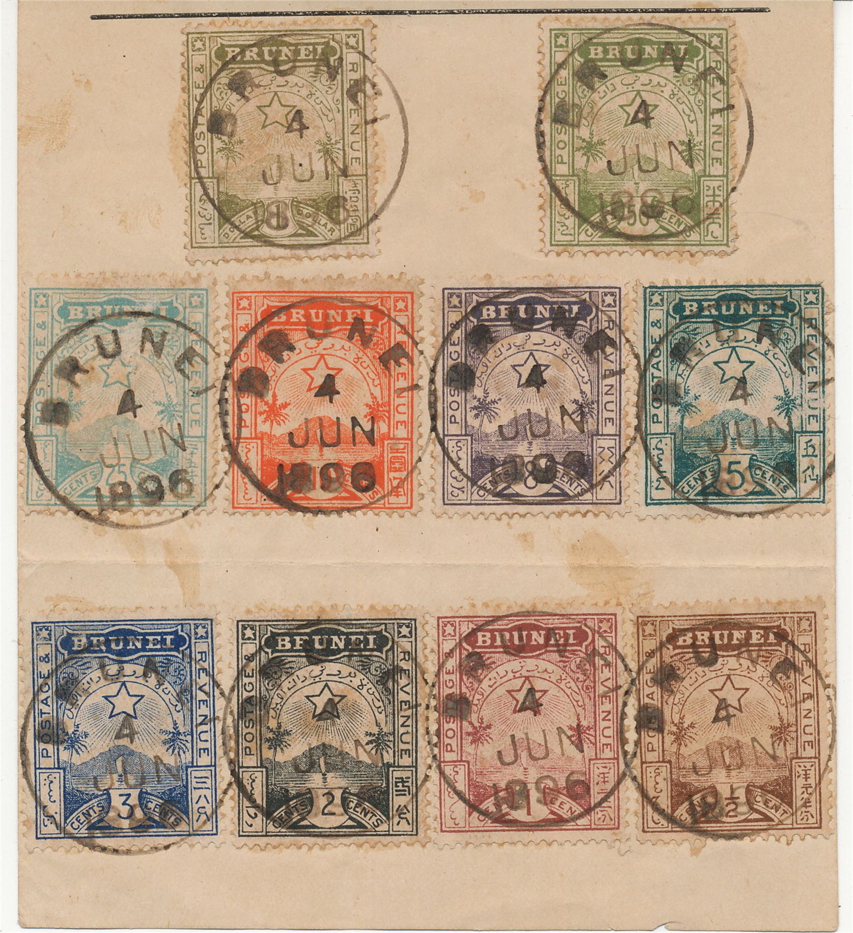 Br. Kolonier BRUNEI. 1-10. Complete set 1895, 10 values on paper CTO 4.6.1896. (£450)