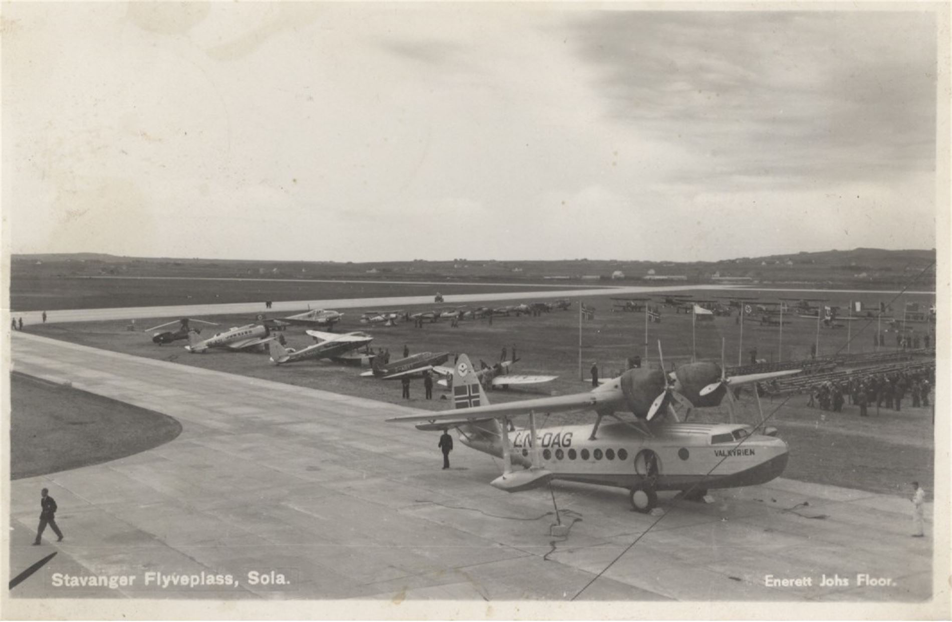 Bildet viser flyplassen på Sola, Stavanger Flyveplass, med flere parkerte fly. Det mest fremtredende flyet i forgrunnen er et Sikorsky S-43 amfibiefly, med registreringen "LN-DAG" "VALKYRIEN"