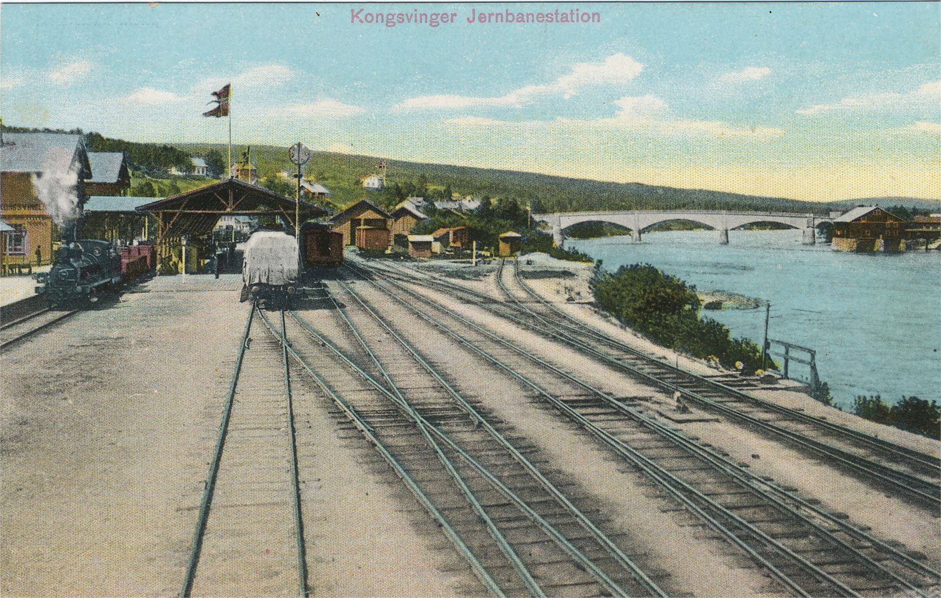 Kongsvinger Jernbanestation. Kolorert kort UB (NK,514) Tog, damp og Splittflagg !