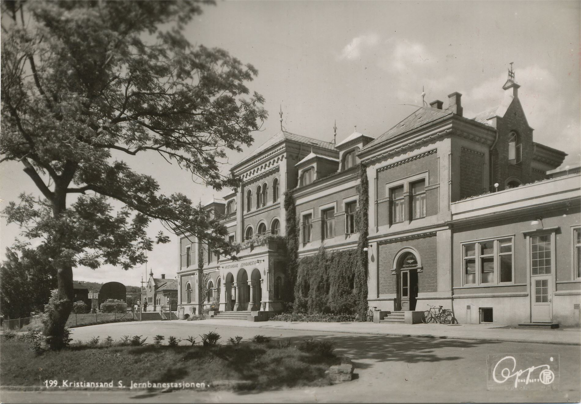 Postkort jernbane KRISTIANSAND S stasjon, gatesiden (VA) A6 s/h (Oppi 199) brukt 1955
