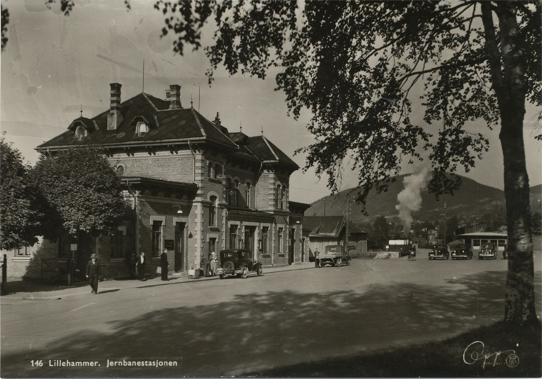 Postkort jernbane LILLEHAMMER stasjon (OP) gatesiden A6 s/h (Oppi 146) ubrukt