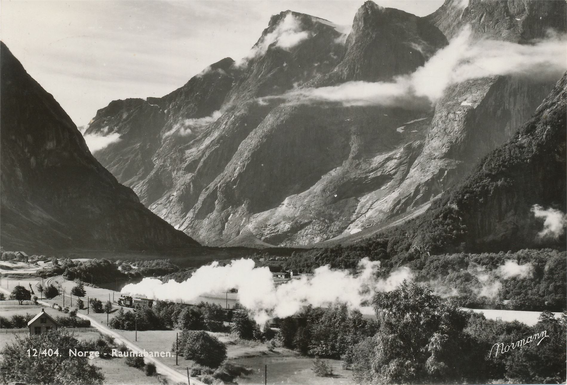 Postkort jernbane Raumabanen med dampende tog (MR) A6 s/h (Normann 12-404) brukt 1956