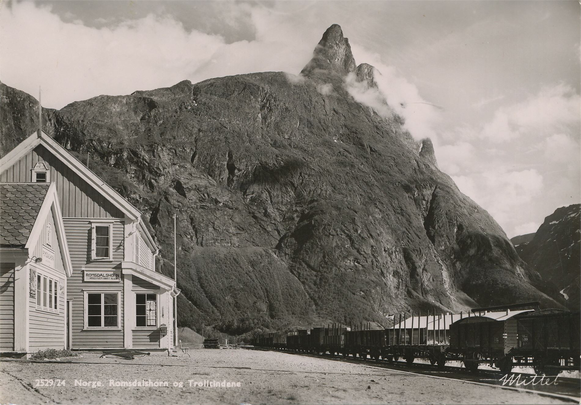 Postkort jernbane ROMSDALSHORN stasjon og Trolltindene (MR) A6 s/h (Mittet 2529-24) ubrukt