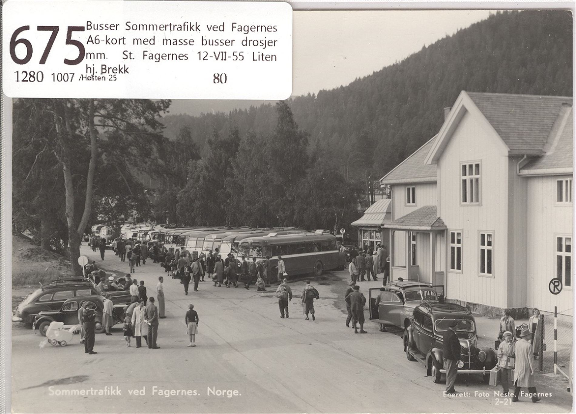 Busser Sommertrafikk ved Fagernes A6-kort med masse busser drosjer mm. St. Fagernes 12-VII-55 Liten hj. Brekk