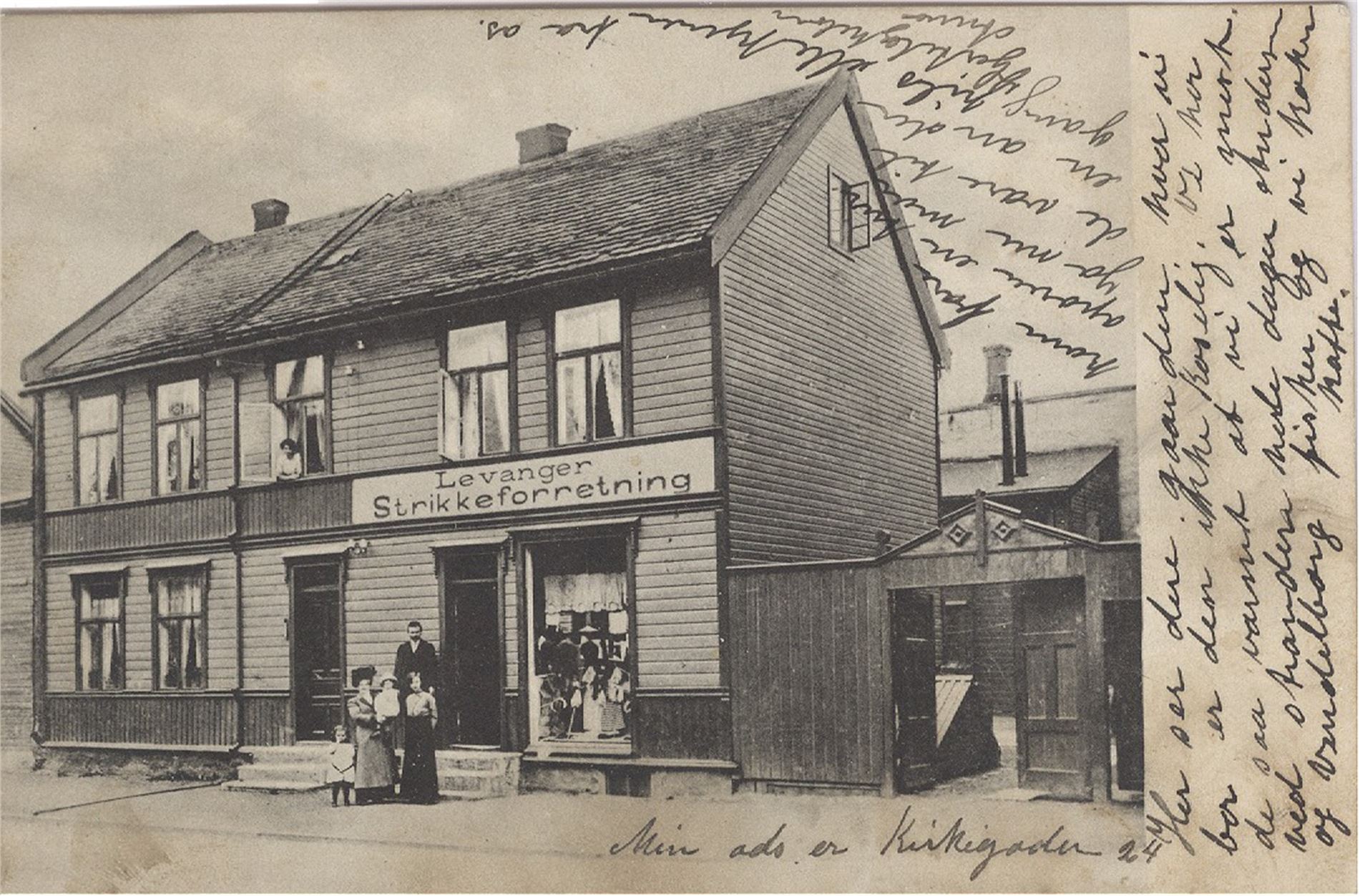 Levanger Strikkeforretning, flott butikkmotiv med eier og familie St. Levangerbanen 1914