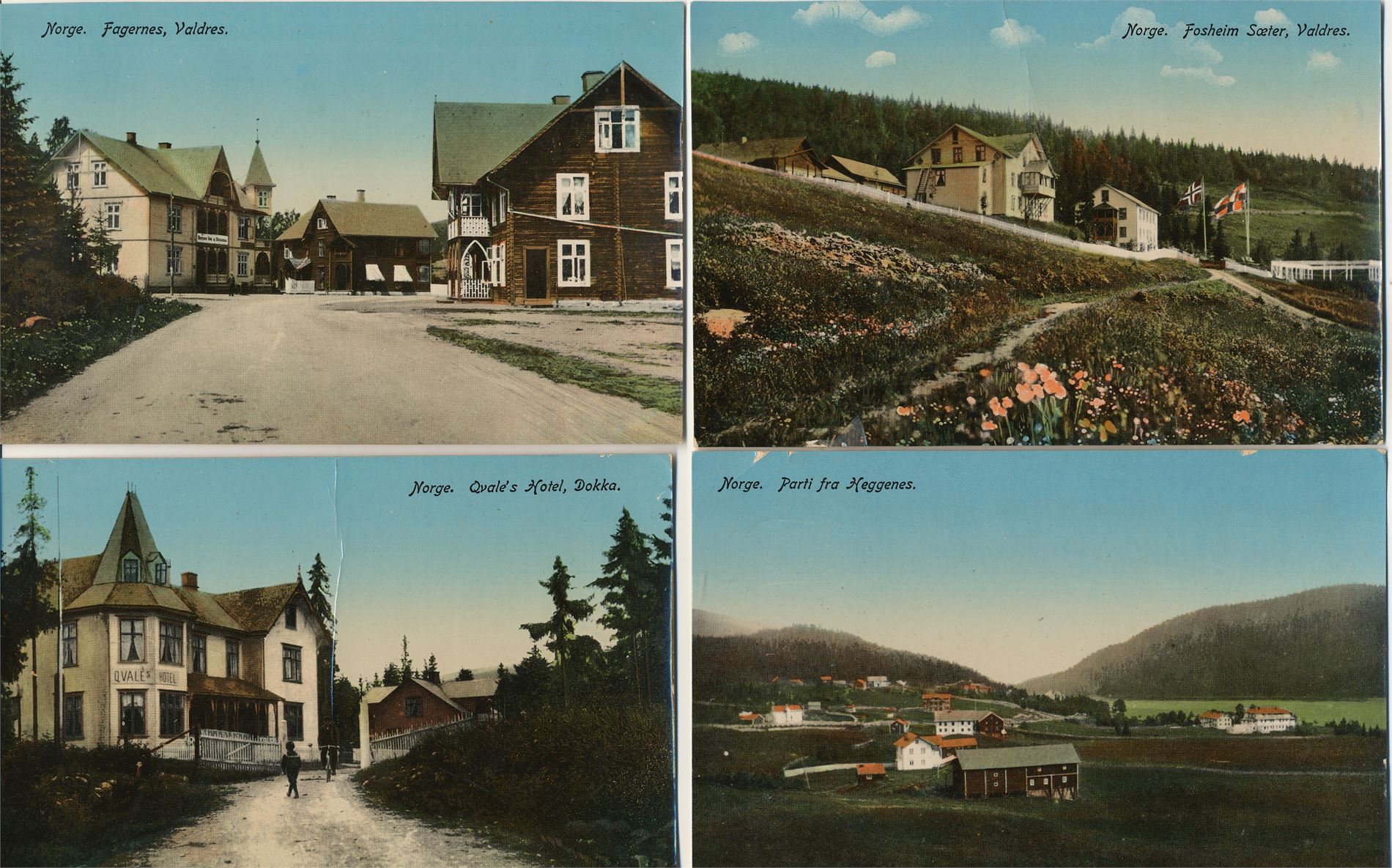 Valdres. 4 glansede og kolorerte kort Dokka,fagernes, Heggenes. (Alle UB) J.H.K, nr 89,94,110 og 111. Flotte kort !