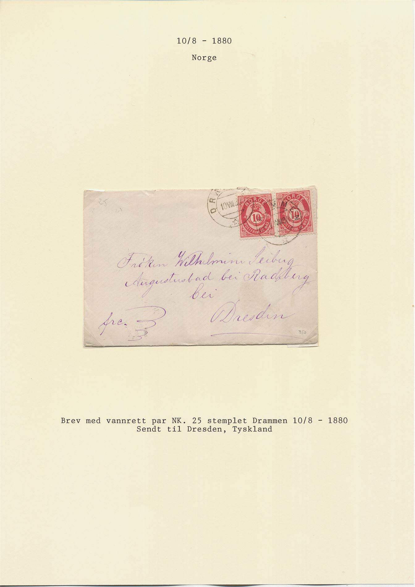 NK 25 Brev med par NK25 stemplet Drammen 10-VIII-80, sendt til Dresden, Tyskland. Ank.st. Bak