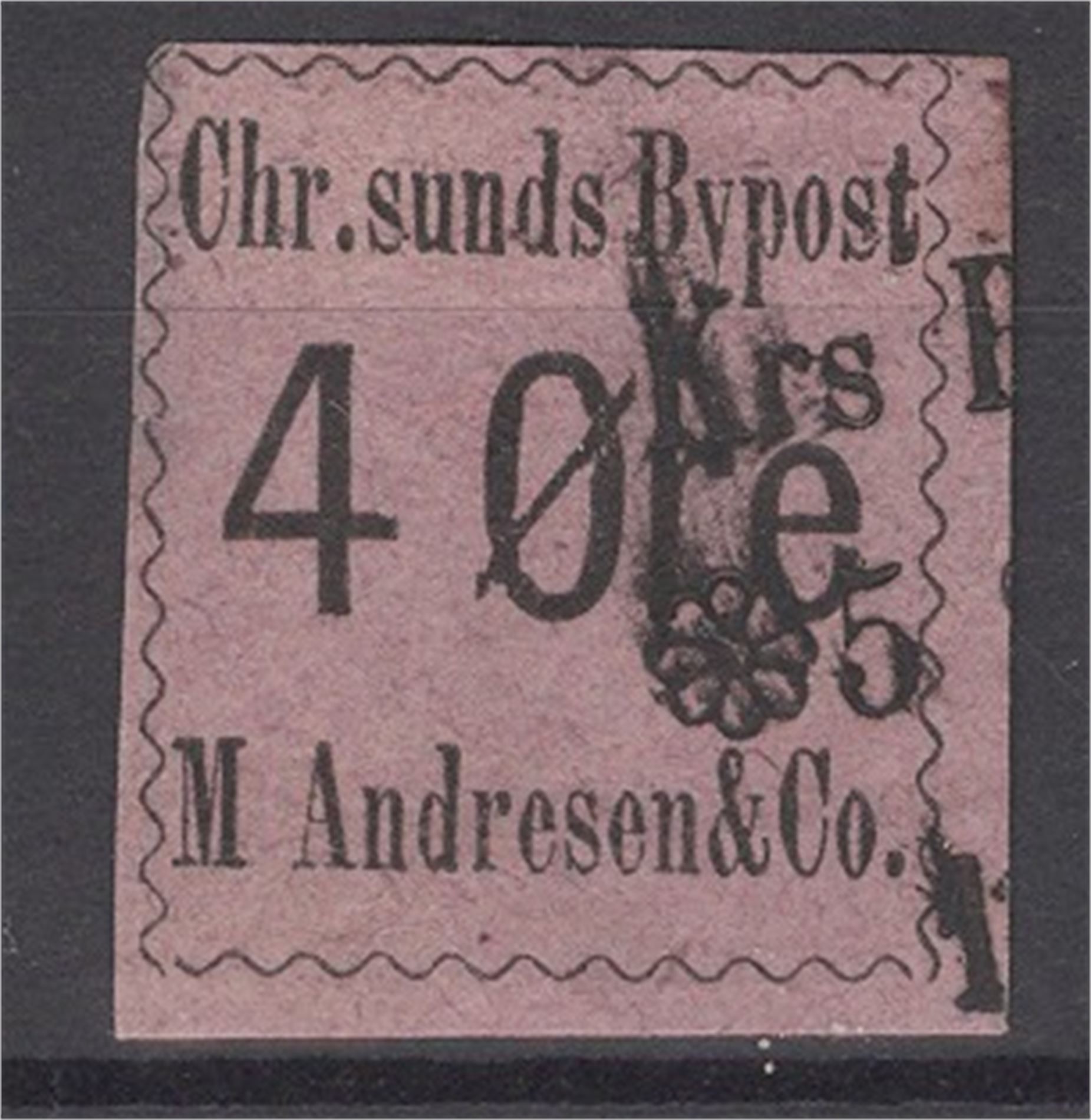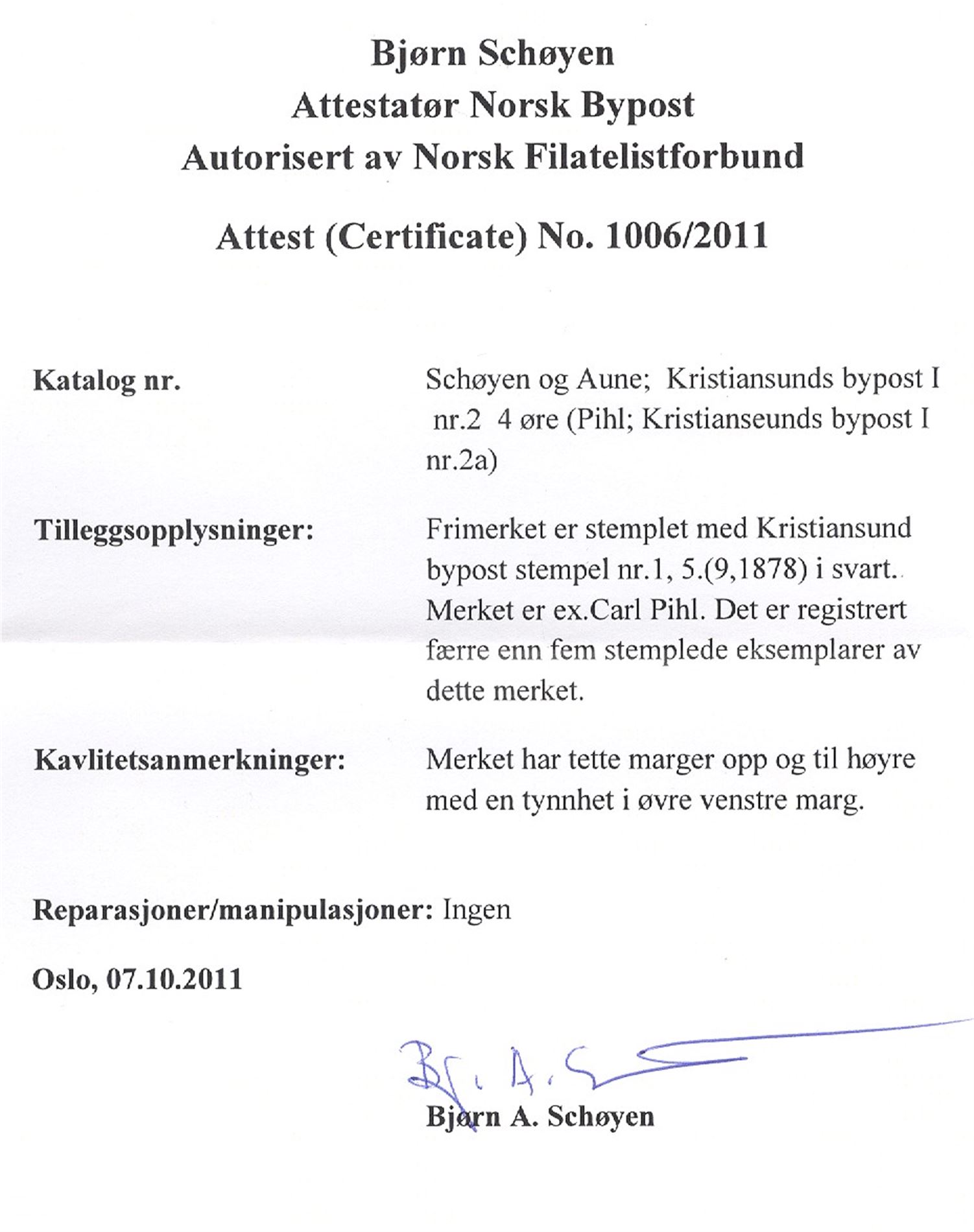 Kristiansund Bypost I nr 2 (S&A)/ 2a (Pihl) Frimerket er stemplet med Kristiansunds bypost stempel nr. 1 5.9.1878 Merket er ex. Carl Pihl Det er registrert færre enn 5 stemplede eksamplarer av dette merket Attest NF