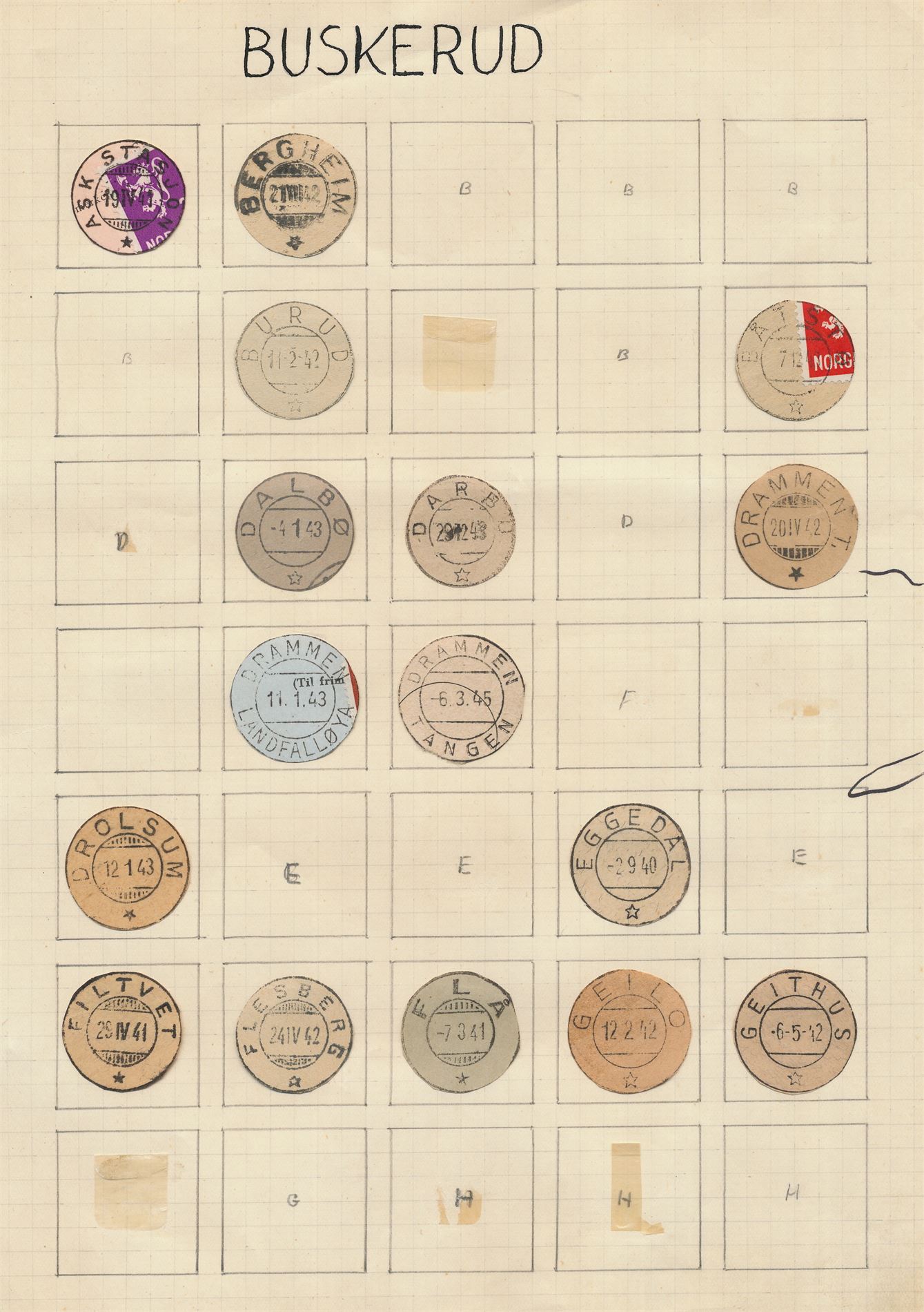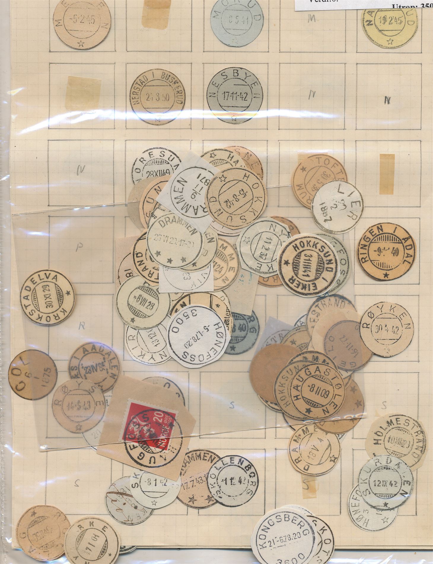 Buskerud Lot med ca 180 stempelklipp fra Buskerud. Mange uvanlige, stort sett ulike.