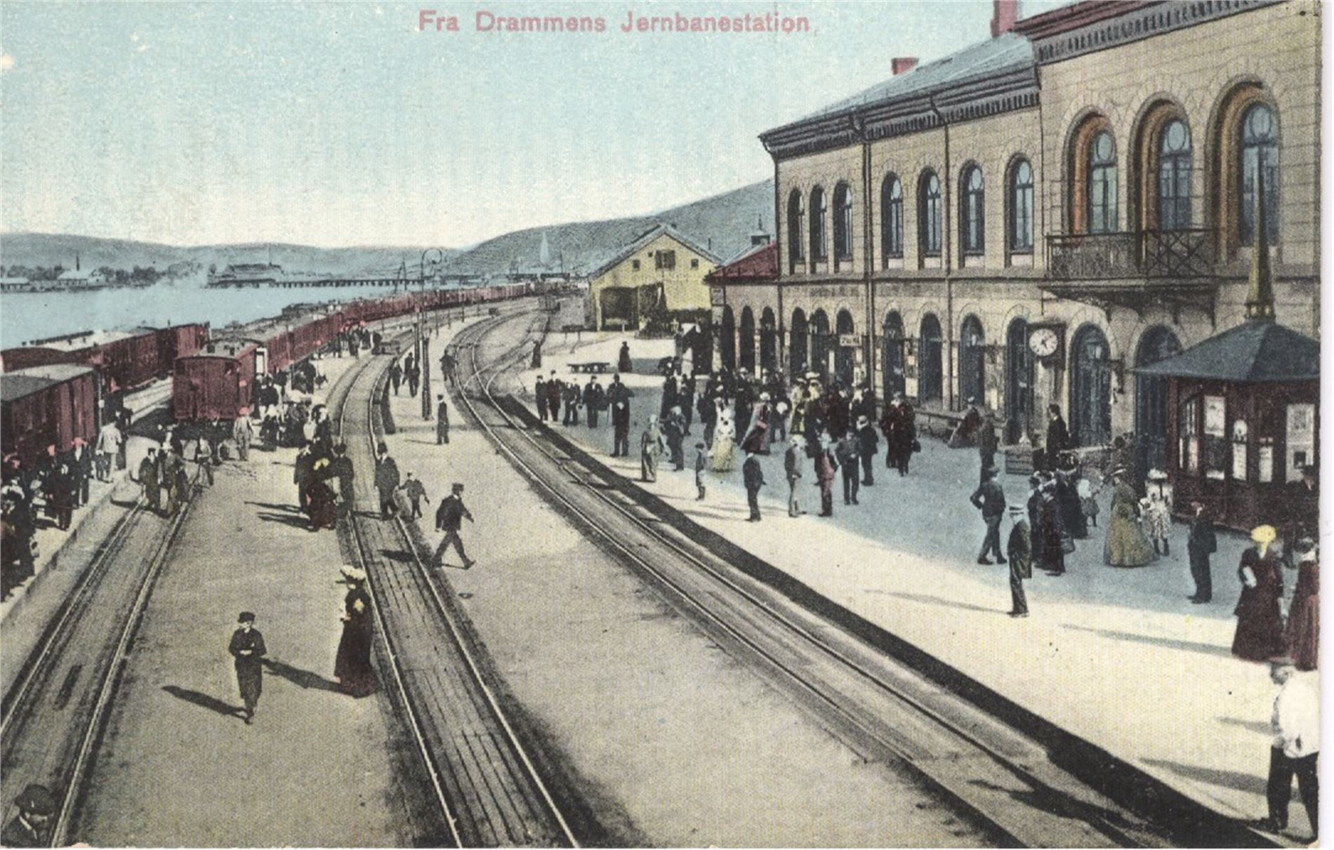 Jernbane Drammen Jernbanestation (NK863) flott kolorert kort med tog og mennesker