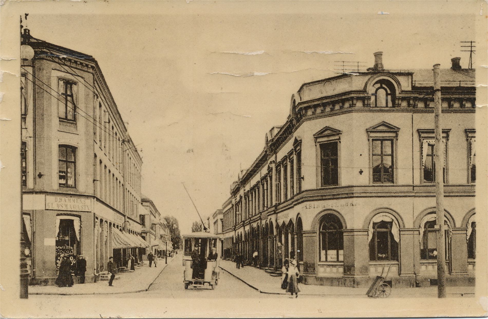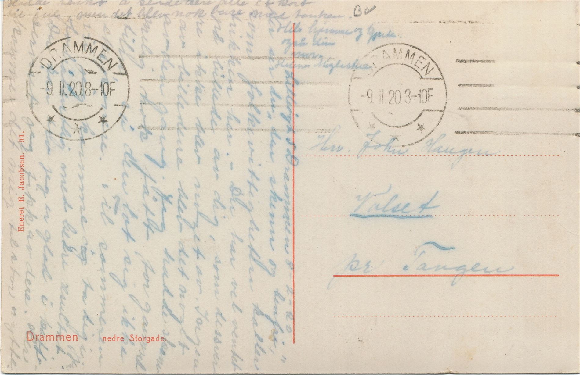 Drammen - Nedre storgt. Med trikk og folk (E.Jacobsen 91) stemplet Drammen 9-II-20