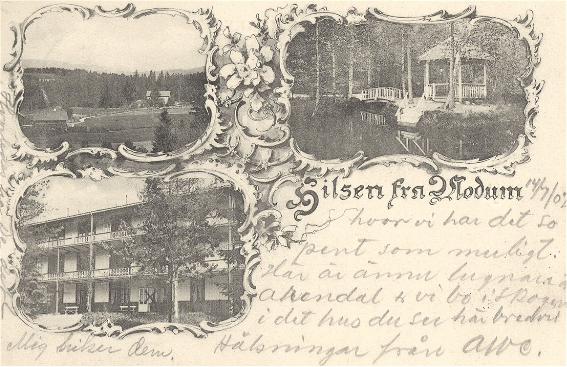 Modum "Hilsen fra Modum" 3-delt motiv st. Vikersund 1902, sendt til Sverige