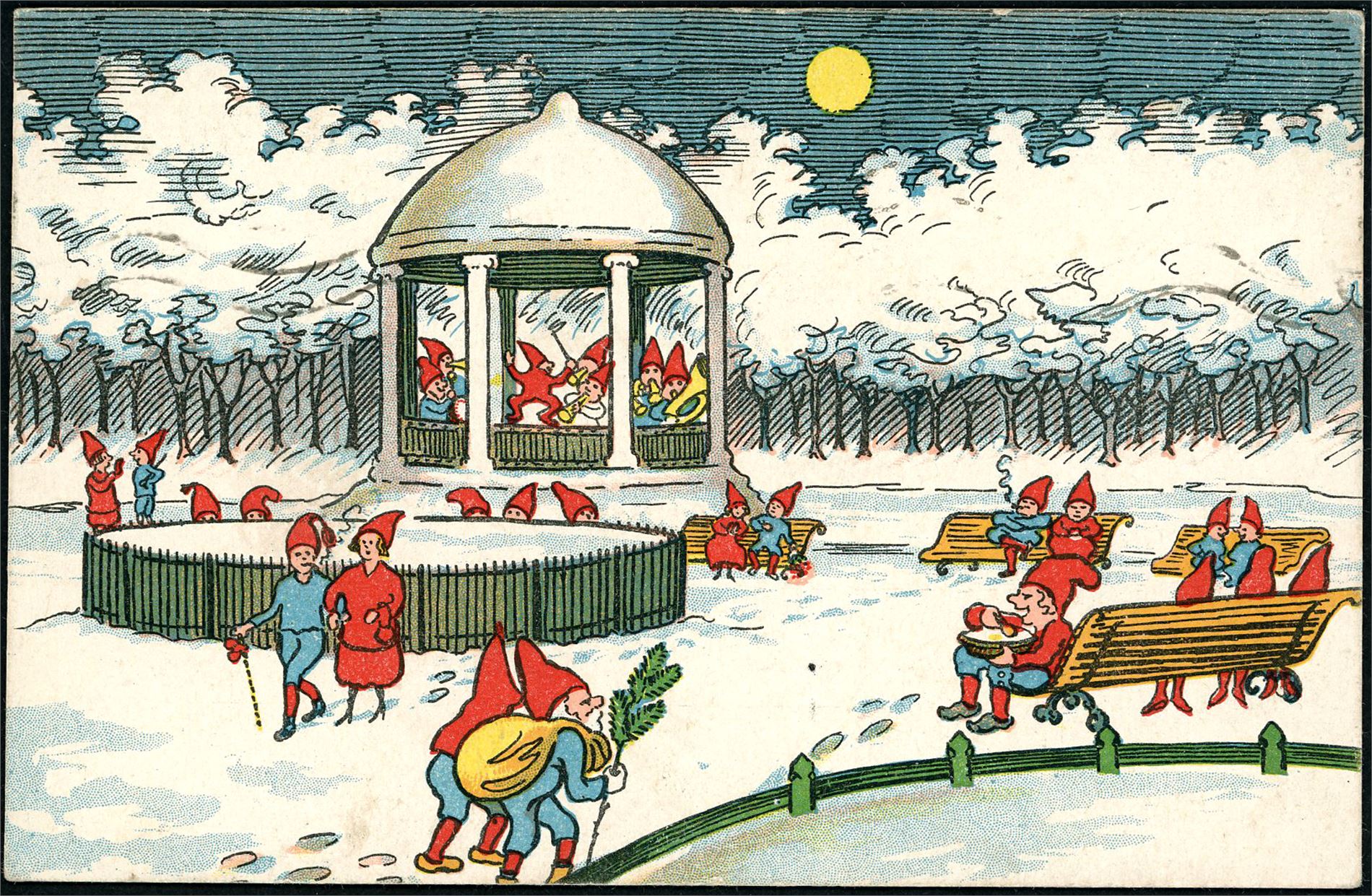 Julenisser spiller i Paviljongen (i Haugesund?). Stemplet "Haugesund 20.12.22". Frimerket mangler. 1