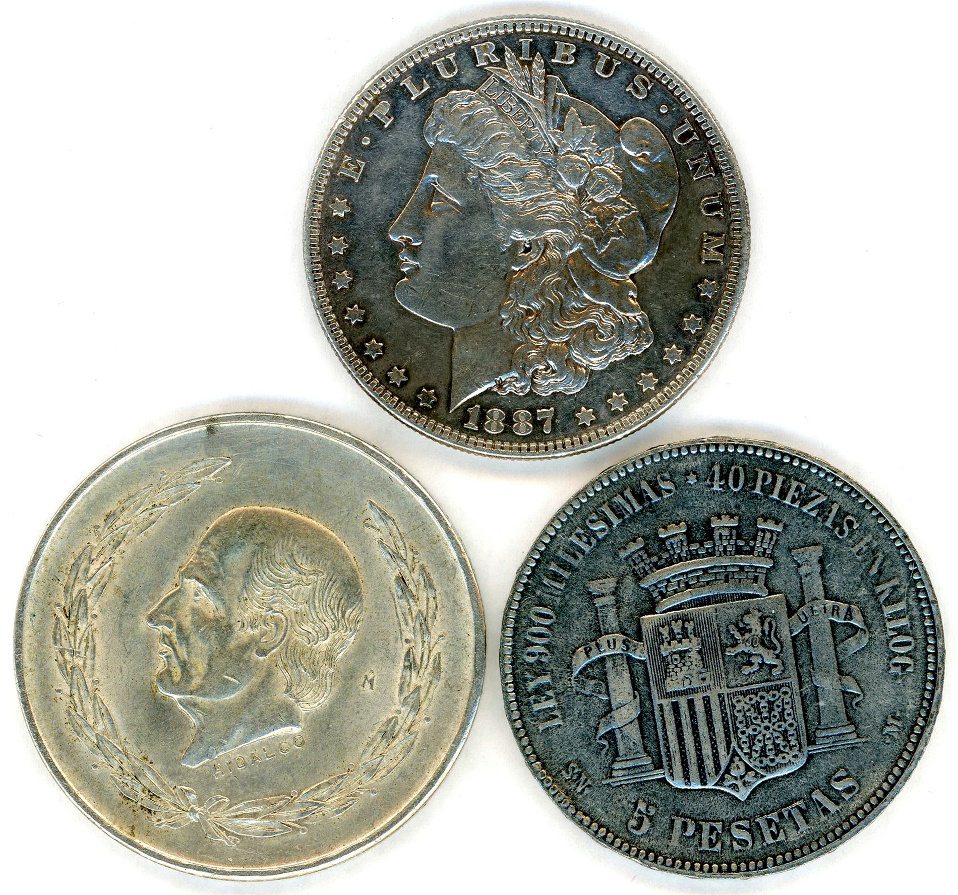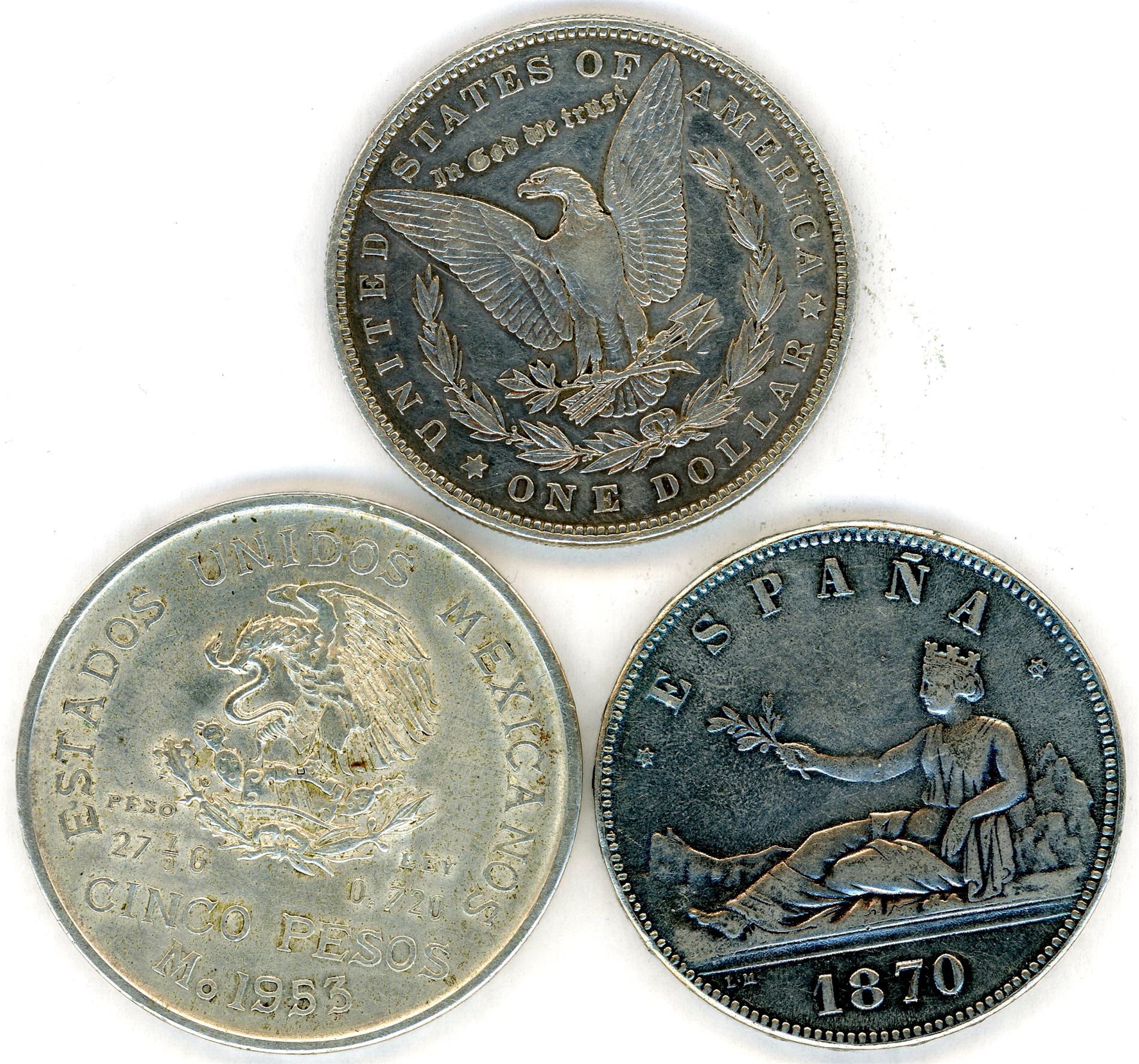 Three coins in silver: 5 Pesetas Spain 1870, US dollar 1887 and 5 Pesos Mexico 1953. VK