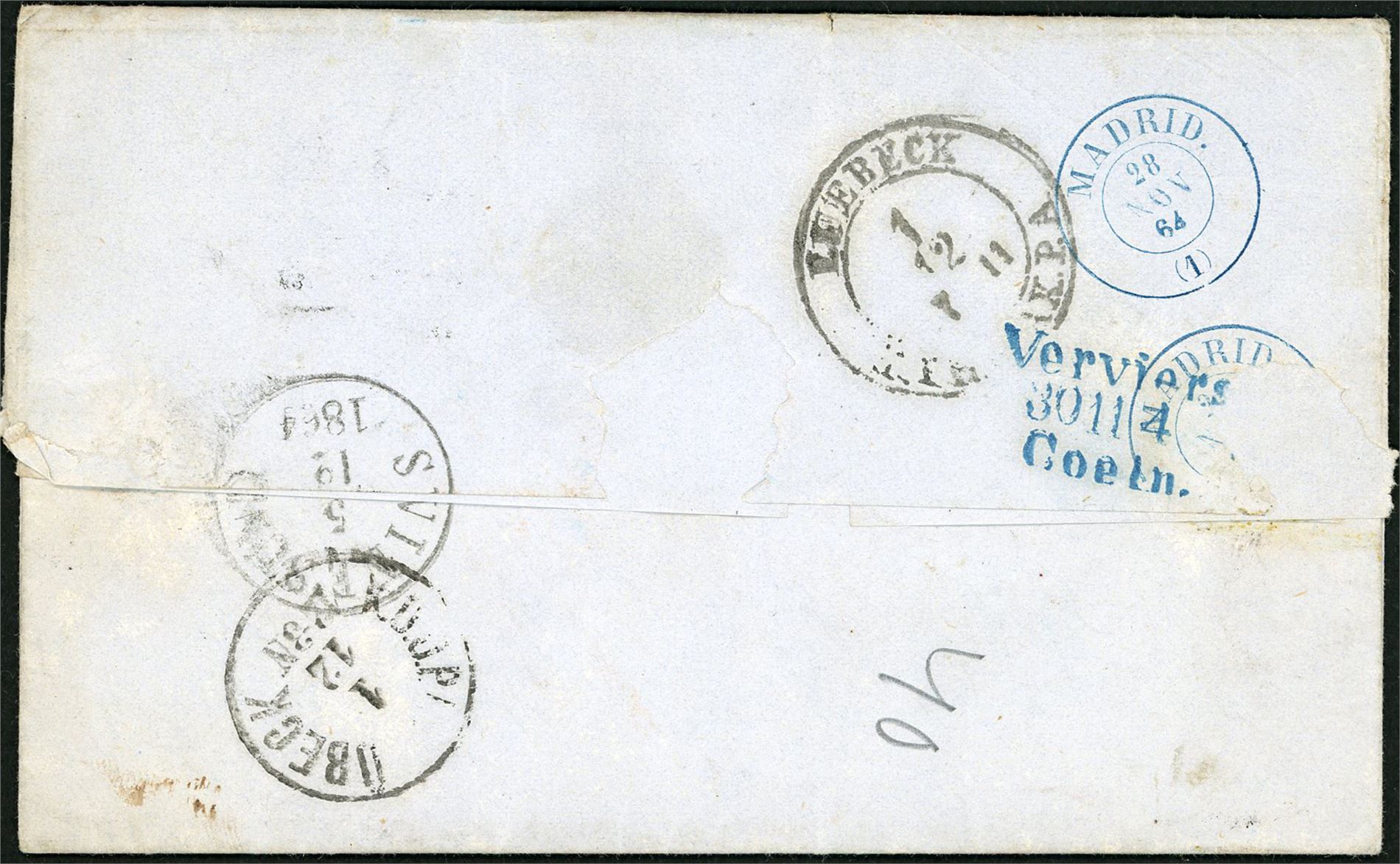 Komplett brev, stemplet "Cadiz 20 Nov" (1864) og sendt til Arendal, Norge. Baksiden stemplet "Madrid 28 Nov 64", "Verviers Coeln 30.11", "Lübeck", "K.D.O.P.A. Lübeck" og "Svinesund 5.12.1864".