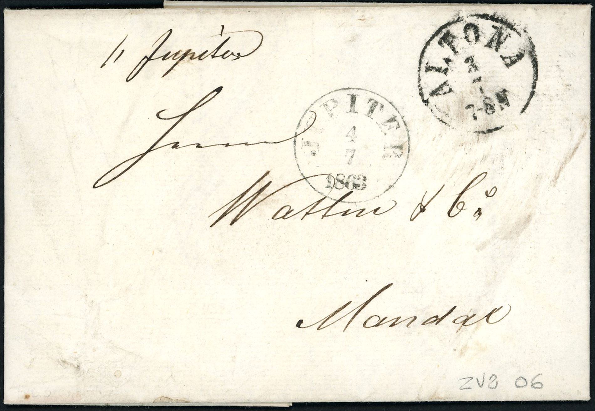 Ufrankert brev, stemplet "Altona 2.7" og sendt til Mandal. Ved siden skipsstempel "Jupiter 4.7.1863".