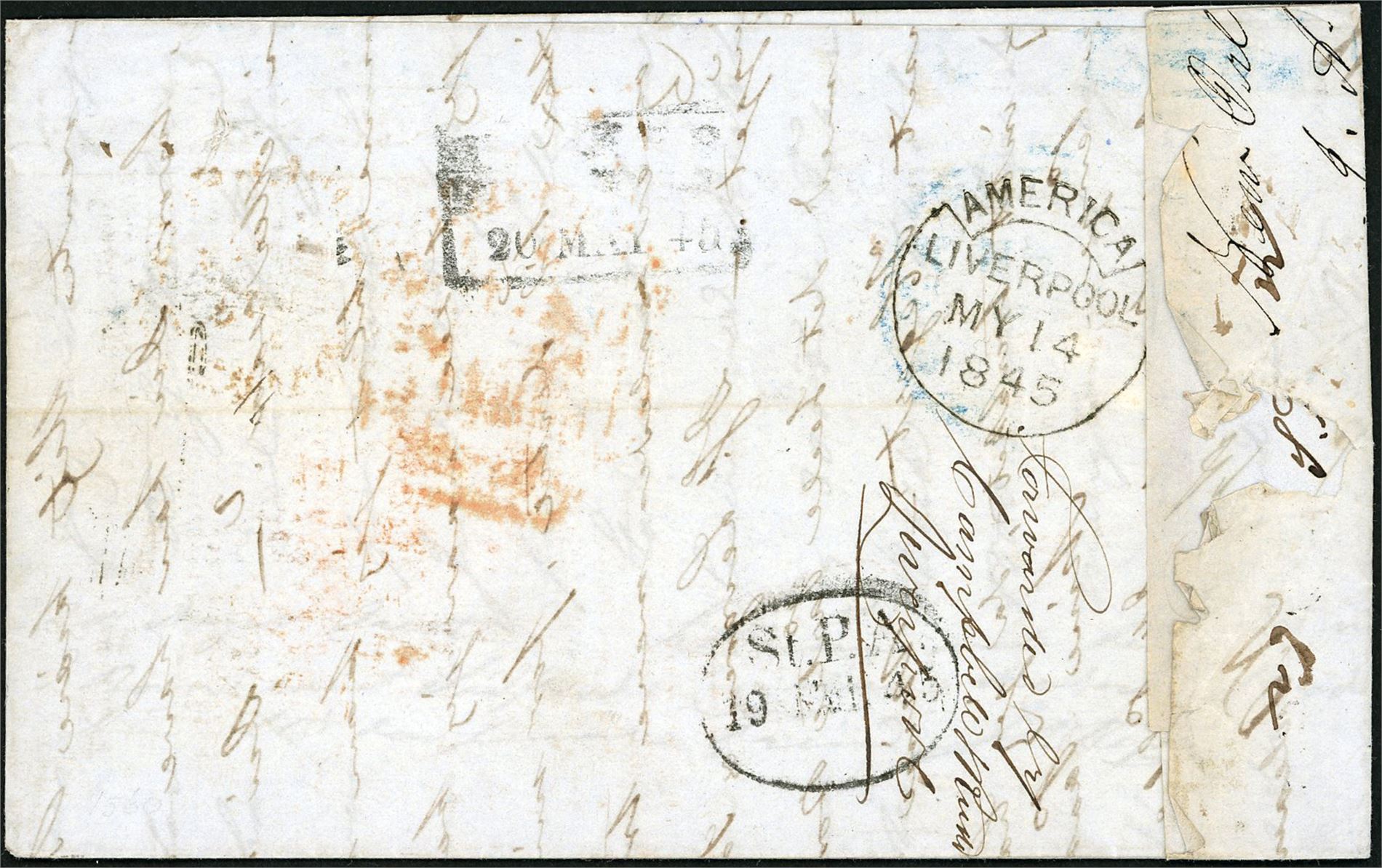Brevomslag, datert "New Orleans den 19 April 1845" og sendt til Arendal. Forsiden stemplet "New Orleans Apr 19", "Paid" samt "Liverpool" og påskrevet bl.a. "25" (cent) i blått, som var portoen til Boston. Brevet er sent med "British packet Caledonia" til England. Baksiden stemplet "America Liverpool My 14 1845" samt St.P.A. 19 Mai 45". Brevet ble i første omgang adressert til Forwarding agenten Cambell & Ruud i Liverpool, der dette navnet er overstrøket før det gikk ble vidresendt til Norge.