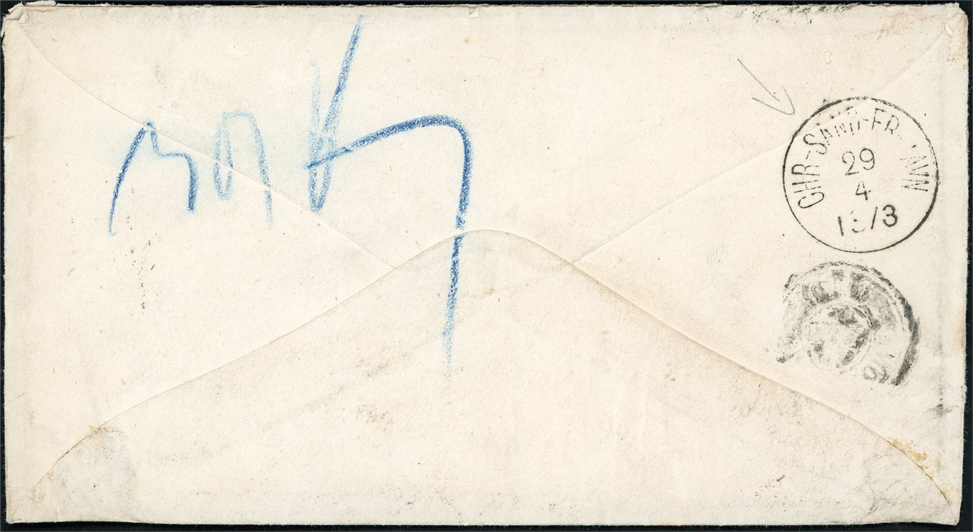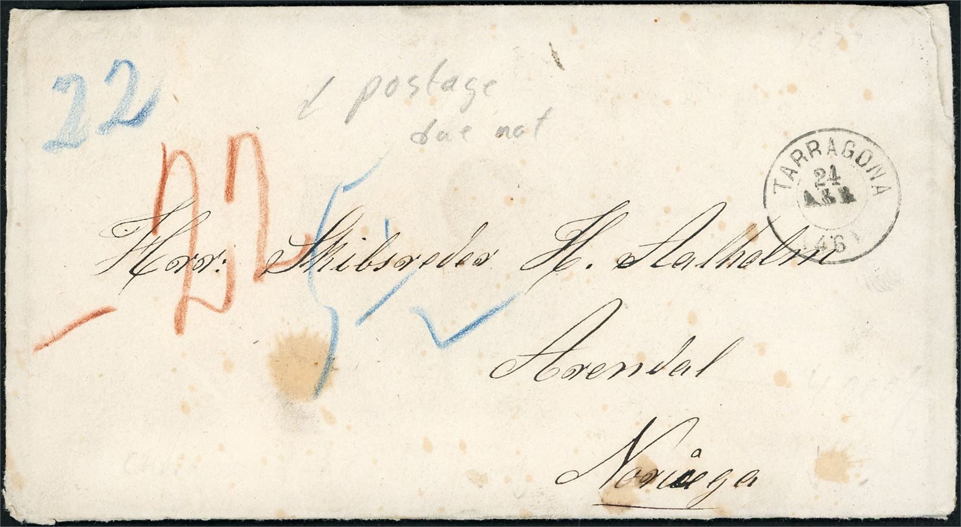 Ufrankert konvolutt, stemplet "Tarragona 24 Abr 46" og sendt til Arendal. Baksiden er bl.a. stemplet "Chr-Sand-Fr-havn 29.4.1873". Noen aldersflekker.