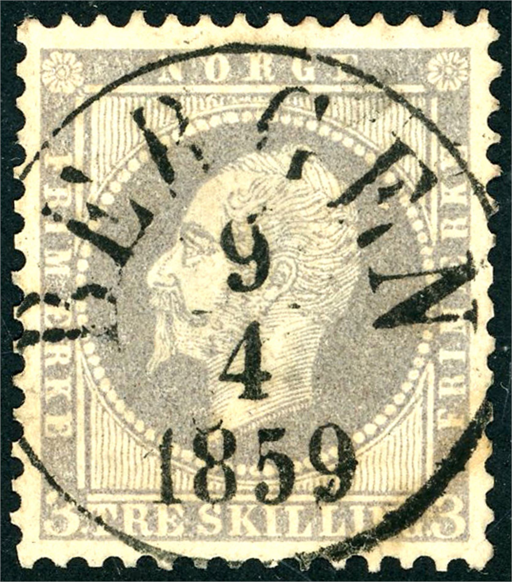 3. 3 skilling Oscar, rettvendt fullstemplet "Bergen 9.4.1859".
