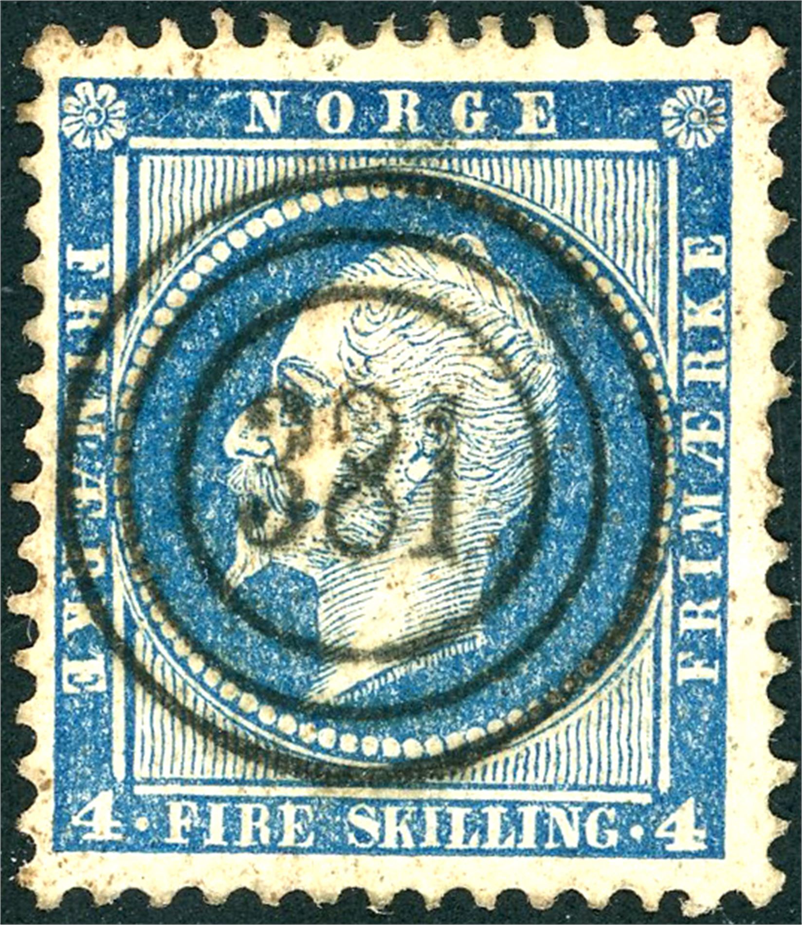 4. 4 skilling Oscar, anert med et rettvendt 3-rings "381" (Digermulen, NO, 8 pkt).