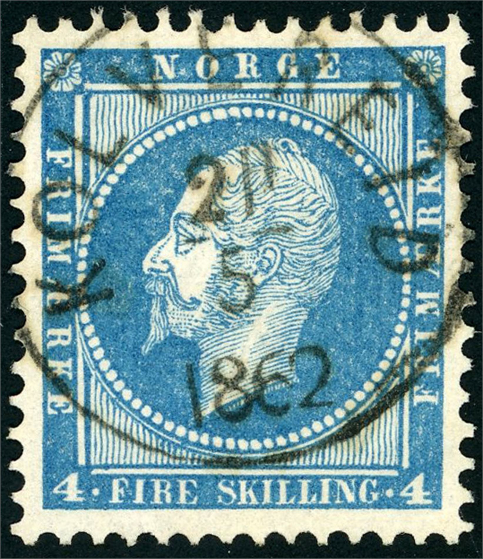 4. 4 skilling Oscar, rettvendt stemplet "Kolvereid 20.5.1862" (NT).
