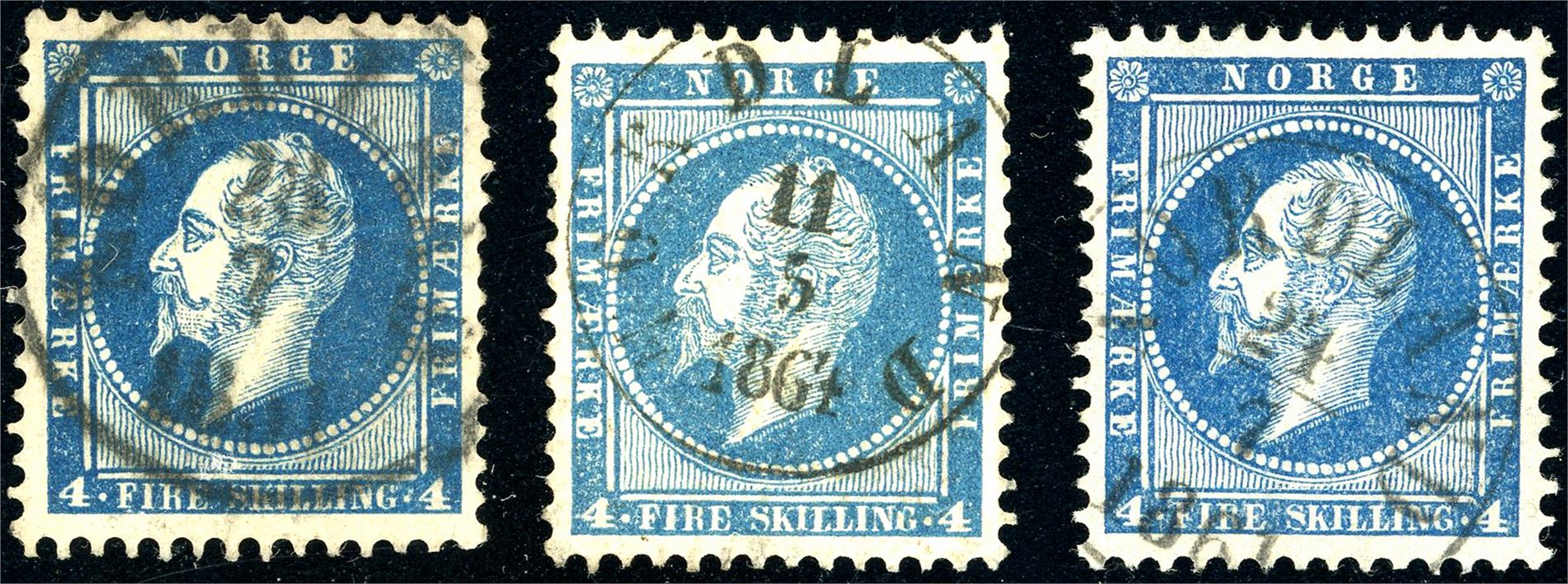 4. Tre 4 skilling Oscar, alle stemplet "Nordland", men med ulike stempeltyper.
