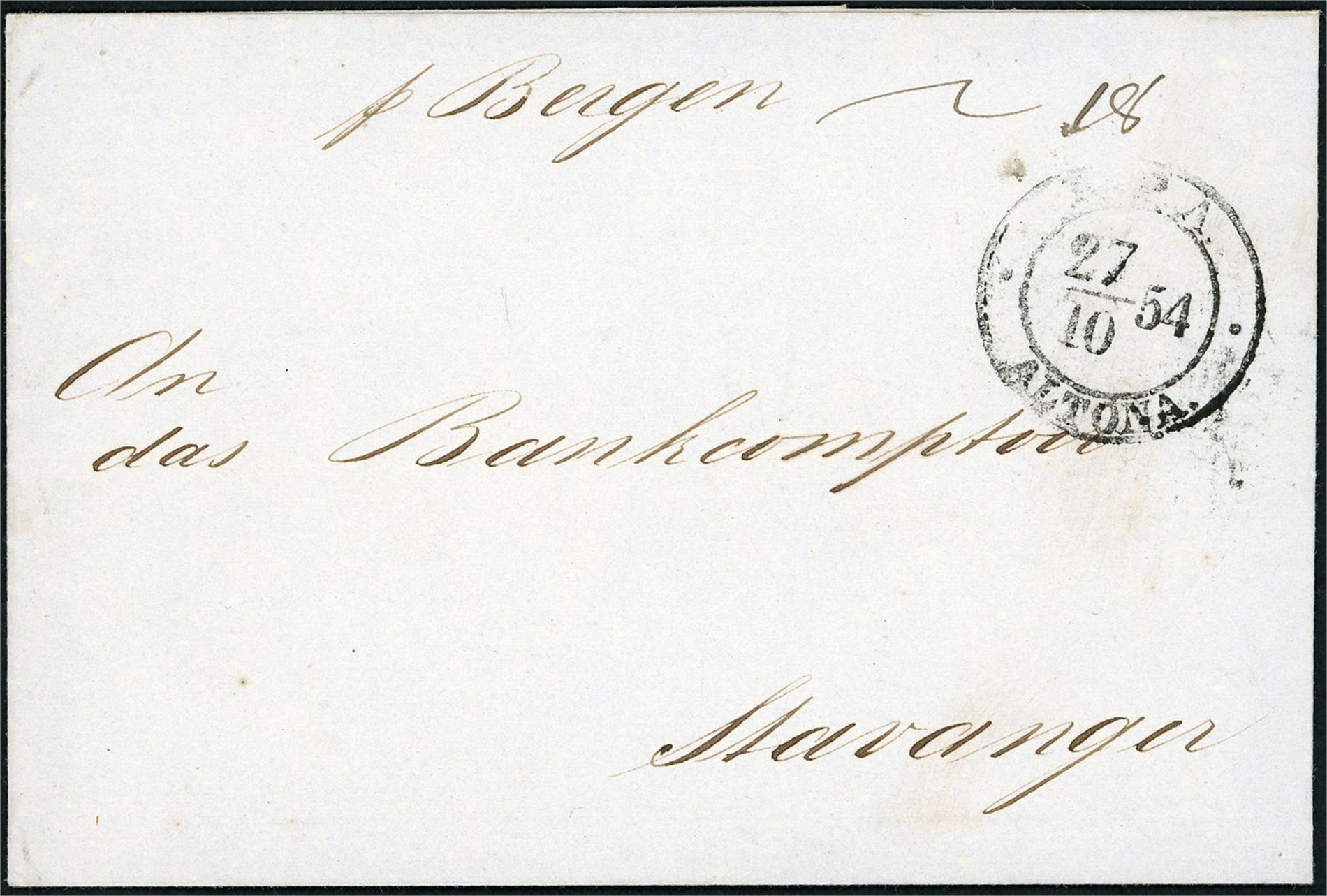 4,5. 4 skilling- og 8 skilling Oscar, begge stemplet "Dampskibet Bergen" samt et brevomslag fra Altone til Stavanger i 1854 med påskriften "pr Bergen". (5197140)