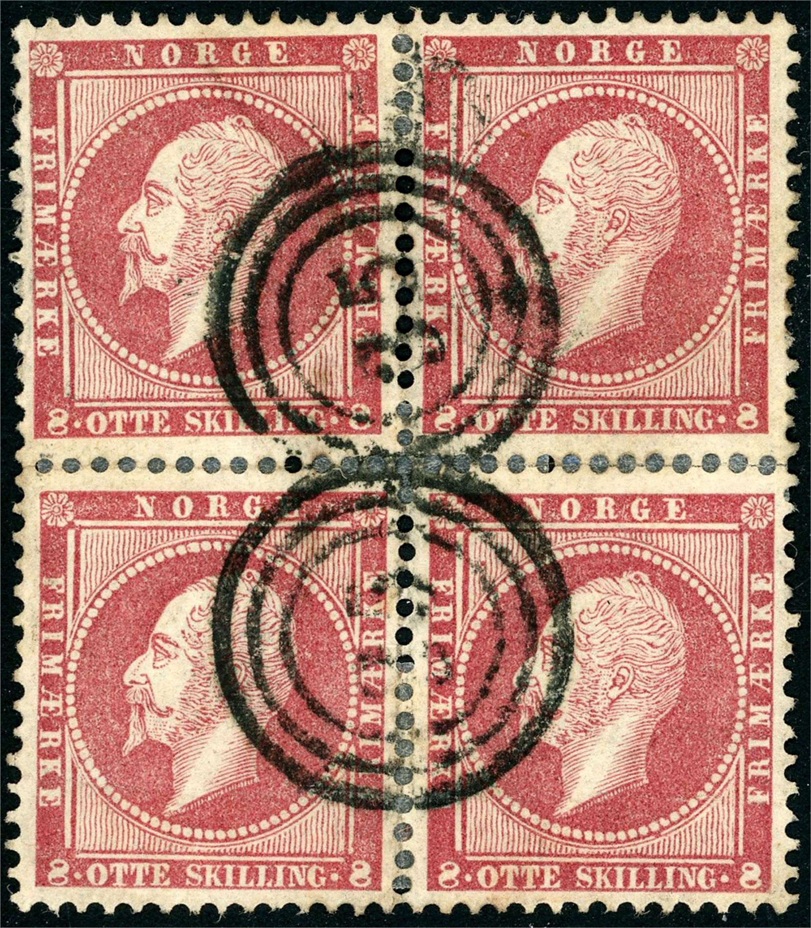 5. 8 skilling Oscar i 4-blokk, anert med trerings "35" (Brevig, TE). Blokken er noe splittet og hengselforsterket.