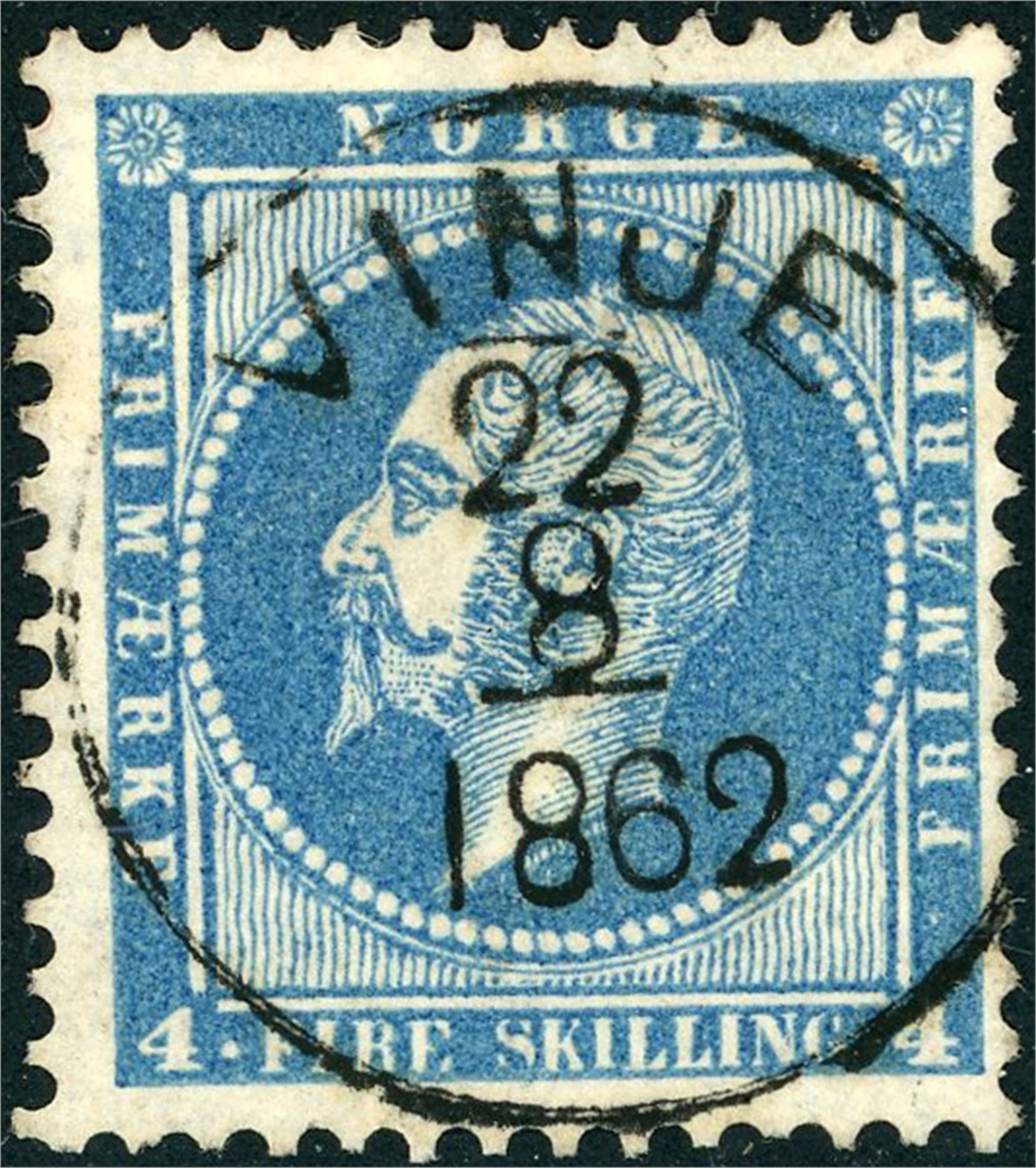 4. 4 skilling Oscar, rettvendt fullstemplet "Vinje 22.8.1862" (TE).