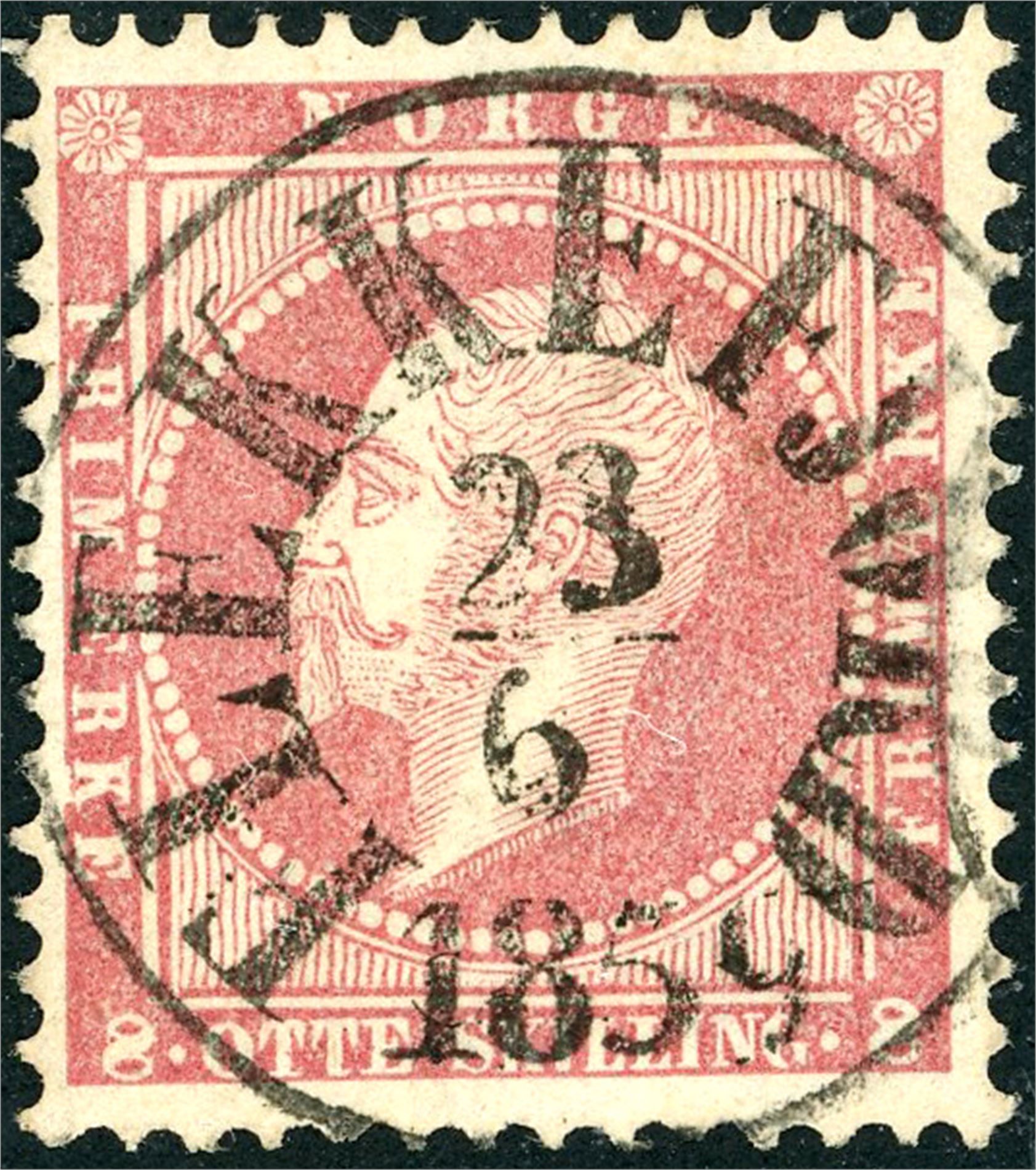 5. 8 skilling Oscar, rettvendt fullstemplet "Flekkefjord 23.6.1859".