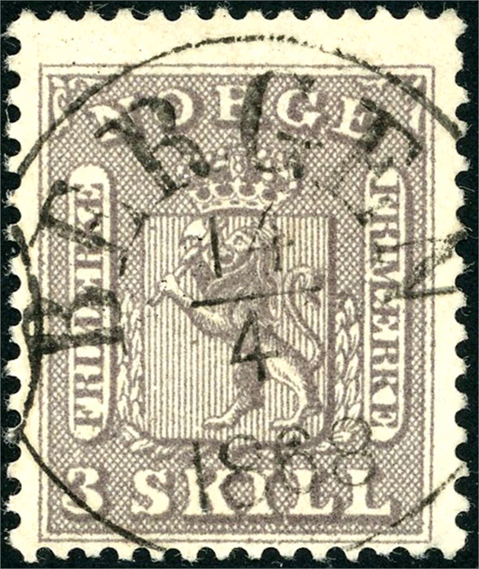 7. 3 skill, rettvendt fullstemplet "Bergen 14.4.1868". Merket med god farge.