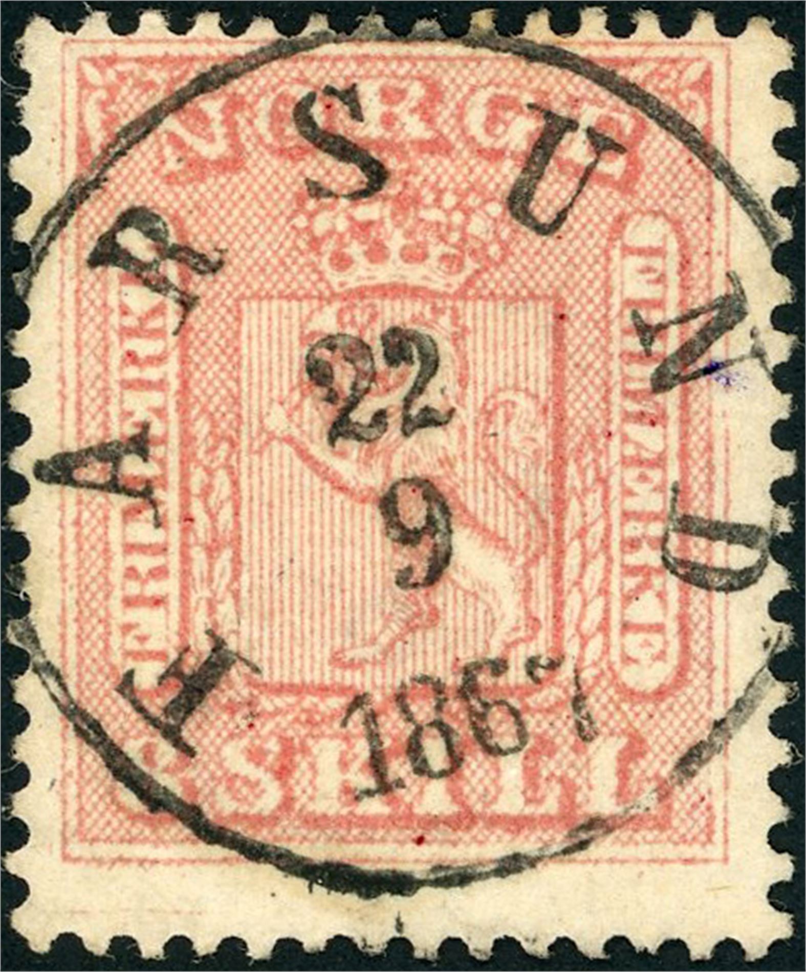 9. 8 skill. Fargefriskt merke, vakkert stemplet "Farsund 22.9.1867" (VA).