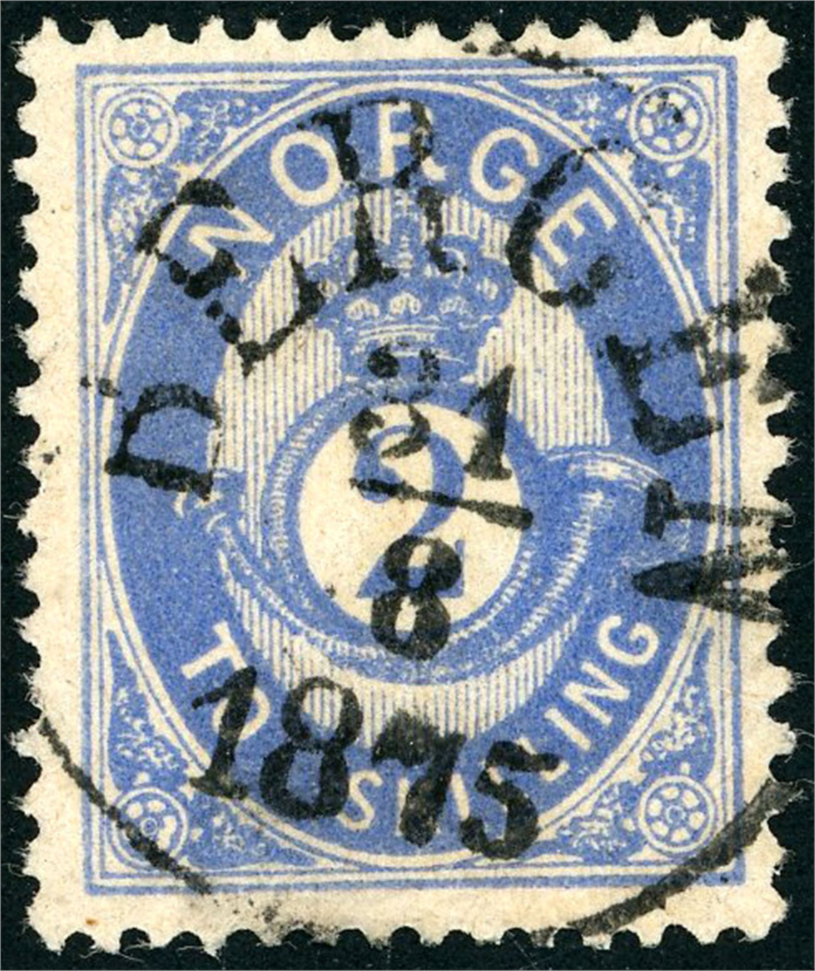 17 c. 2 skilling Posthorn iultramarin nyanse, fullstemplet "Bergen 31.8.1875".